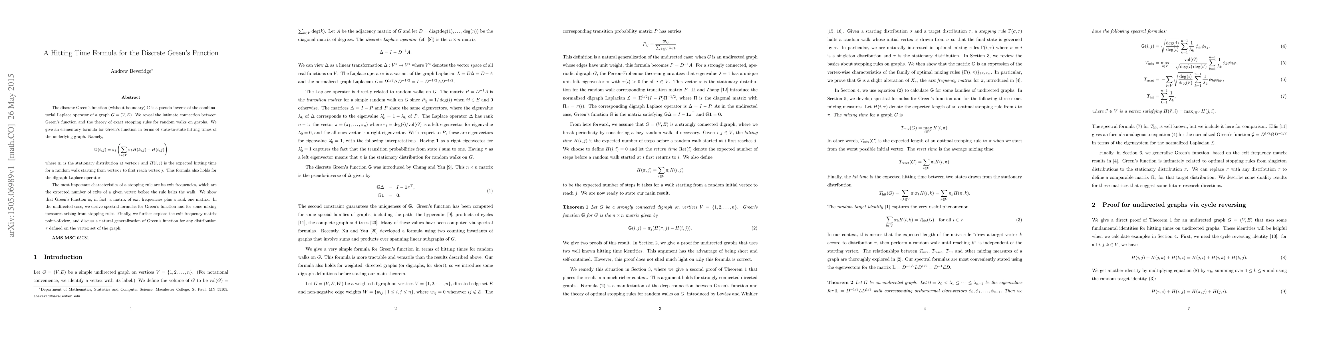 A new formula for the discrete Green's function is introduced, which relates to hitting times of random walks on graphs, providing insights into exit frequencies and stopping rules.