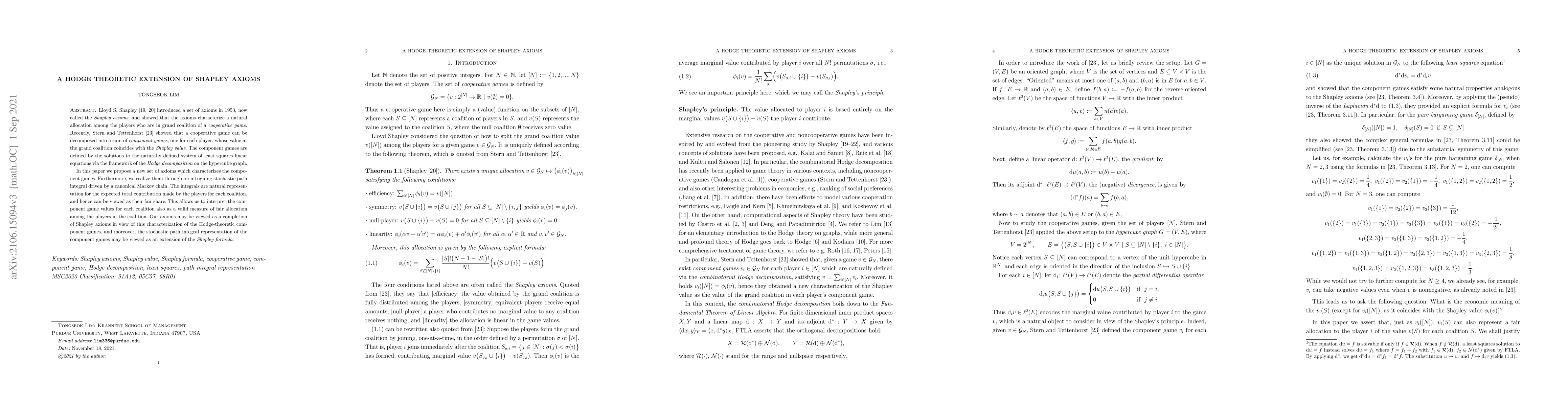 Lloyd S. Shapley \cite{Shapley1953a, Shapley1953} introduced a set of axioms in 1953, now called the {\em Shapley axioms}, and showed that the axioms characterize a natural allocation among the players who are in grand coalition of a {\em cooperative game}. Recently, \citet{StTe2019} showed that a cooperative game can be decomposed into a sum of {\em component games}, one for each player, whose value at the grand coalition coincides with the {\em Shapley value}. The component games are defined by the solutions to the naturally defined system of least squares linear equations via the framework of the {\em Hodge decomposition} on the hypercube graph. In this paper we propose a new set of axioms which characterizes the component games. Furthermore, we realize them through an intriguing stochastic path integral driven by a canonical Markov chain. The integrals are natural representation for the expected total contribution made by the players for each coalition, and hence can be viewed as their fair share. This allows us to interpret the component game values for each coalition also as a valid measure of fair allocation among the players in the coalition. Our axioms may be viewed as a completion of Shapley axioms in view of this characterization of the Hodge-theoretic component games, and moreover, the stochastic path integral representation of the component games may be viewed as an extension of the {\em Shapley formula}.