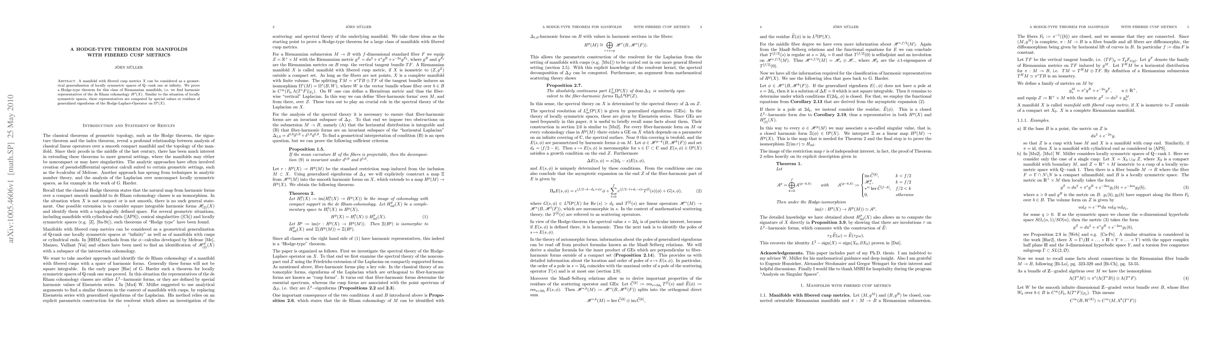 A manifold with fibered cusp metrics $X$ can be considered as a geometrical generalization of locally symmetric spaces of $\mathbb{Q}$-rank one at infinity. We prove a Hodge-type theorem for this class of Riemannian manifolds, i.e. we find harmonic representatives of the de Rham cohomology $H^p(X)$. Similar to the situation of locally symmetric spaces, these representatives are computed by special values or residues of generalized eigenforms of the Hodge-Laplace-Operator on $\Omega^p(X)$.