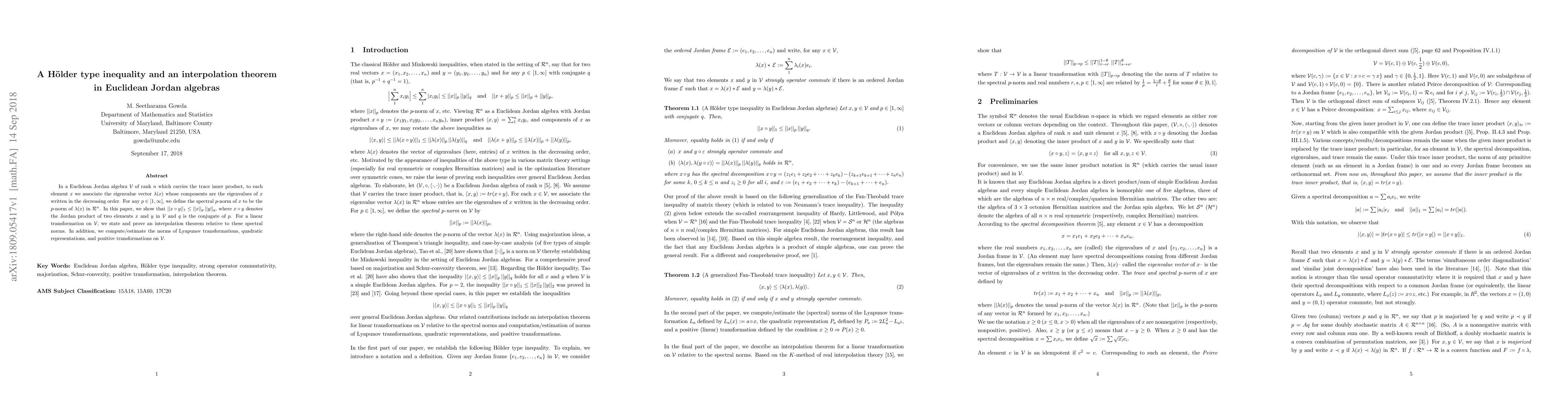 In a Euclidean Jordan algebra V of rank n which carries the trace inner product, to each element x we associate the eigenvalue vector whose components are the eigenvalues of x written in the decreasing order. For any number p between (and including) one and infinity, we define the spectral p-norm of x to be the p-norm of the corresponding eigenvalue vector in the Euclidean n-space. In this paper, we show that for any two elements x and y, the one-norm of the Jordan product xoy is less than or equal to the product of p-norm of x and q-norm of y, where q is the conjugate of p. For a linear transformation on V, we state and prove an interpolation theorem relative to these spectral norms. In addition, we compute/estimate the norms of Lyapunov transformations, quadratic representations, and positive transformations on V.