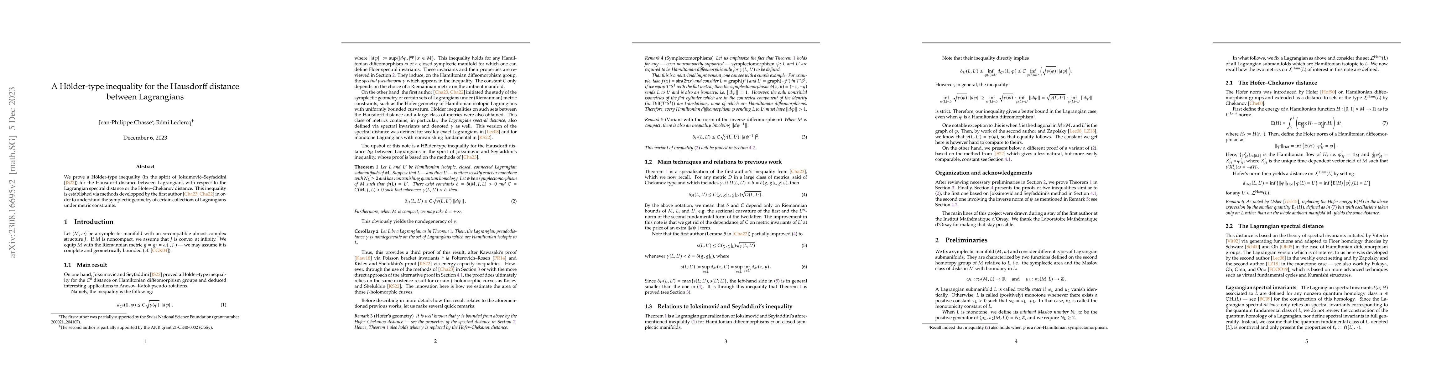 This paper establishes a H\"older-type inequality for the Hausdorff distance between Lagrangians concerning the Lagrangian spectral distance or Hofer-Chekanov distance. The proof utilizes methods developed by the first author to explore the symplectic geometry of Lagrangians under metric constraints.