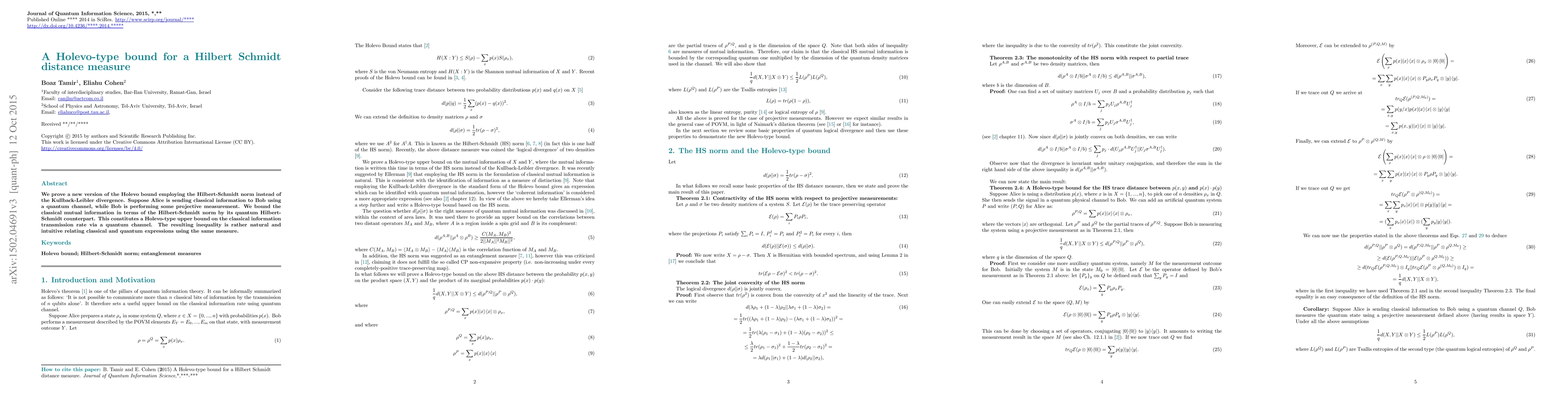 This paper establishes a new Holevo bound using the Hilbert-Schmidt norm instead of Kullback-Leibler divergence, providing an upper limit on classical information transmission via a quantum channel. The derived inequality intuitively connects classical and quantum information measures.