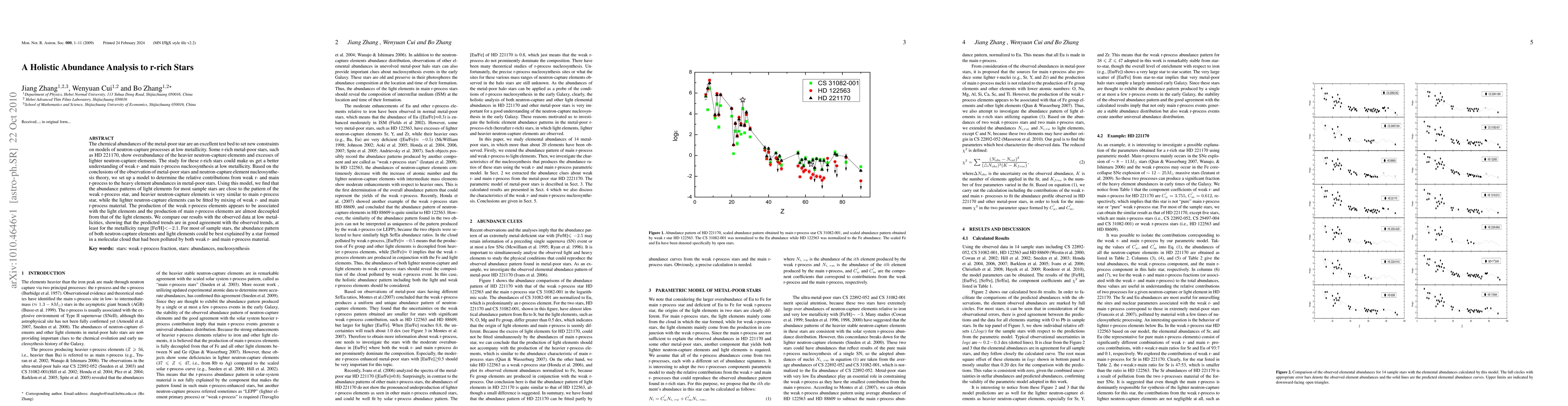 The chemical abundances of metal-poor stars are an excellent test bed by which to set new constraints on models of neutron-capture processes at low metallicity. Some r-process-rich (hereafter r-rich) metal-poor stars, such as HD221170, show an overabundance of the heavier neutron-capture elements and excesses of lighter neutron-capture elements. The study of these r-rich stars could give us a better understanding of weak and main r-process nucleosynthesis at low metallicity. Based on conclusions from the observation of metal-poor stars and neutron-capture element nucleosynthesis theory, we set up a model to determine the relative contributions from weak and main r-processes to the heavy-element abundances in metal-poor stars. Using this model, we find that the abundance patterns of light elements for most sample stars are close to the pattern of weak r-process stars, and those of heavier neutron-capture elements very similar to the pattern of main r-process stars, while the lighter neutron-capture elements can be fitted by the mixing of weak and main r-process material. The production of weak r-process elements appears to be associated with the light elements, while the production of main r-process elements is almost decoupled from that of the light elements. We compare our results with the observed data at low metallicities, showing that the predicted trends are in good agreement with the observed trends, at least for the metallicity range [Fe/H] < -2.1. For most sample stars, the abundance patterns of both neutron-capture elements and light elements could be best explained by a star formed in a molecular cloud that has been polluted by both weak and main r-process material.