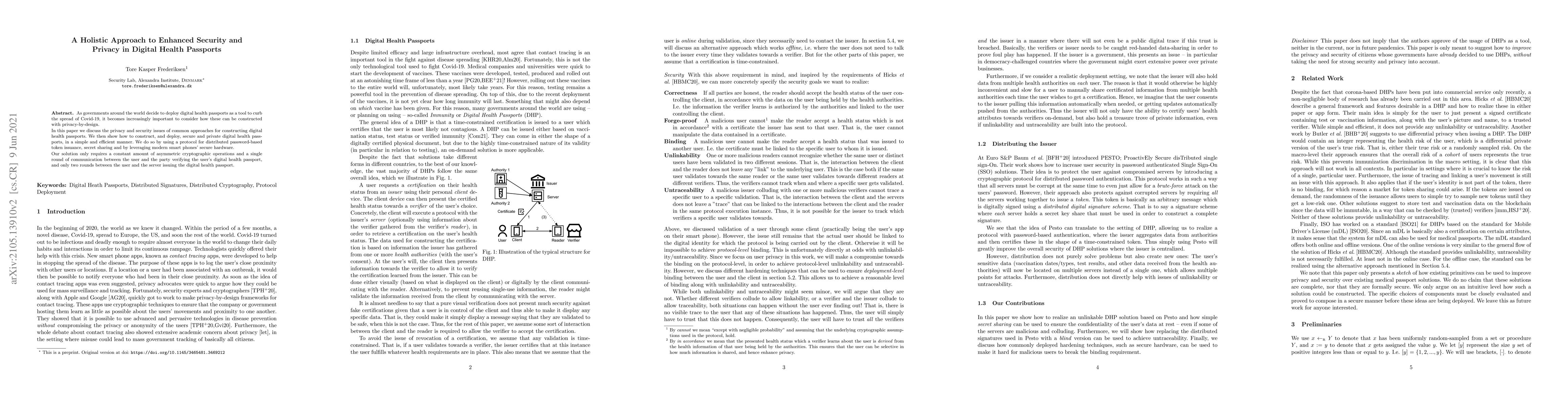 This paper explores the privacy and security challenges in creating digital health passports to combat Covid-19, proposing a protocol that uses distributed password-based token issuance, secret sharing, and smartphone secure hardware to ensure secure and private verification with minimal communication and cryptographic operations.