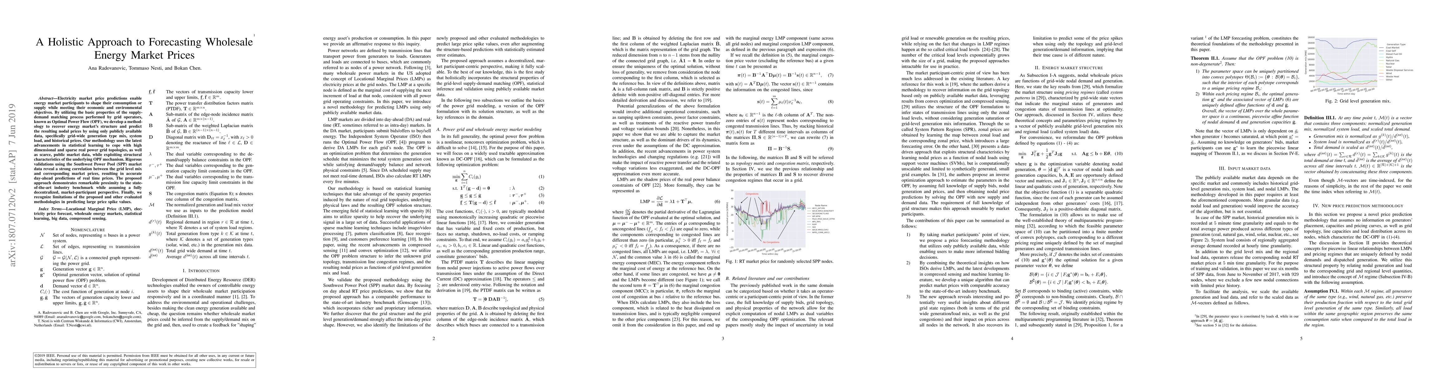 Electricity market price predictions enable energy market participants to shape their consumption or supply while meeting their economic and environmental objectives. By utilizing the basic properties of the supply-demand matching process performed by grid operators, known as Optimal Power Flow (OPF), we develop a methodology to recover energy market's structure and predict the resulting nodal prices by using only publicly available data, specifically grid-wide generation type mix, system load, and historical prices. Our methodology uses the latest advancements in statistical learning to cope with high dimensional and sparse real power grid topologies, as well as scarce, public market data, while exploiting structural characteristics of the underlying OPF mechanism. Rigorous validations using the Southwest Power Pool (SPP) market data reveal a strong correlation between the grid level mix and corresponding market prices, resulting in accurate day-ahead predictions of real time prices. The proposed approach demonstrates remarkable proximity to the state-of-the-art industry benchmark while assuming a fully decentralized, market-participant perspective. Finally, we recognize the limitations of the proposed and other evaluated methodologies in predicting large price spike values.