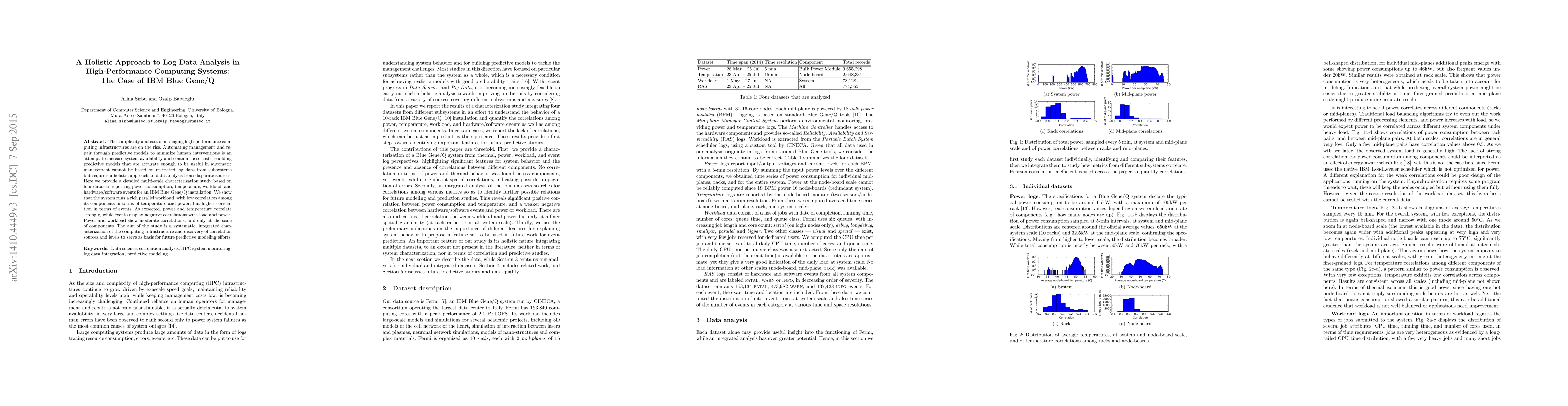 This paper presents a comprehensive analysis of log data from an IBM Blue Gene/Q system, revealing low correlations in temperature and power but higher event correlations. The study aims to provide a holistic view of the computing infrastructure to inform future predictive models for automated management.