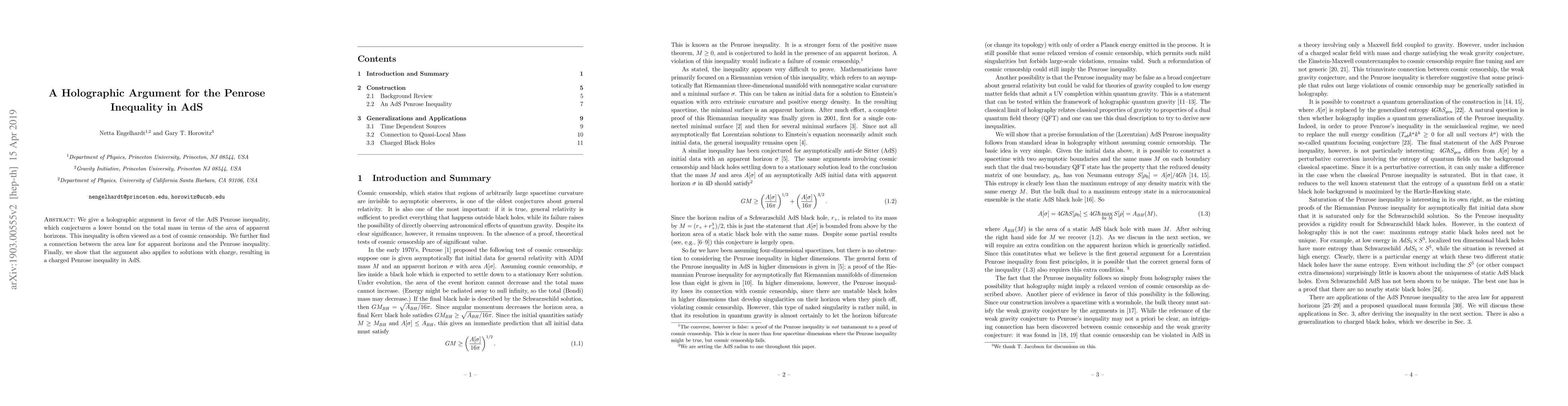 This paper presents a holographic argument supporting the AdS Penrose inequality, which sets a lower bound on total mass based on apparent horizon areas, often linked to cosmic censorship. The study also reveals a connection between the area law for apparent horizons and the inequality, extending the argument to charged solutions.