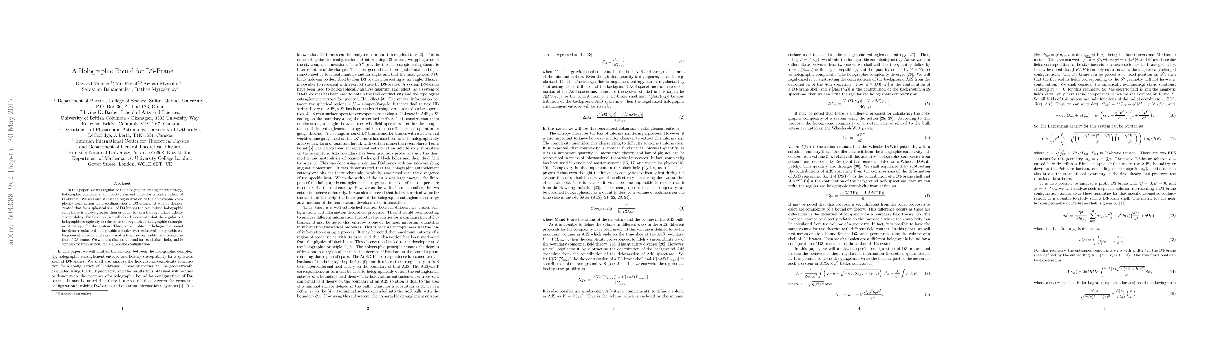 This paper investigates the regularization of holographic entanglement entropy, complexity, and fidelity susceptibility for D3-brane configurations, demonstrating a holographic bound that relates these quantities. It shows that the regularized holographic complexity exceeds or equals the regularized fidelity susceptibility for a spherical shell of D3-branes.