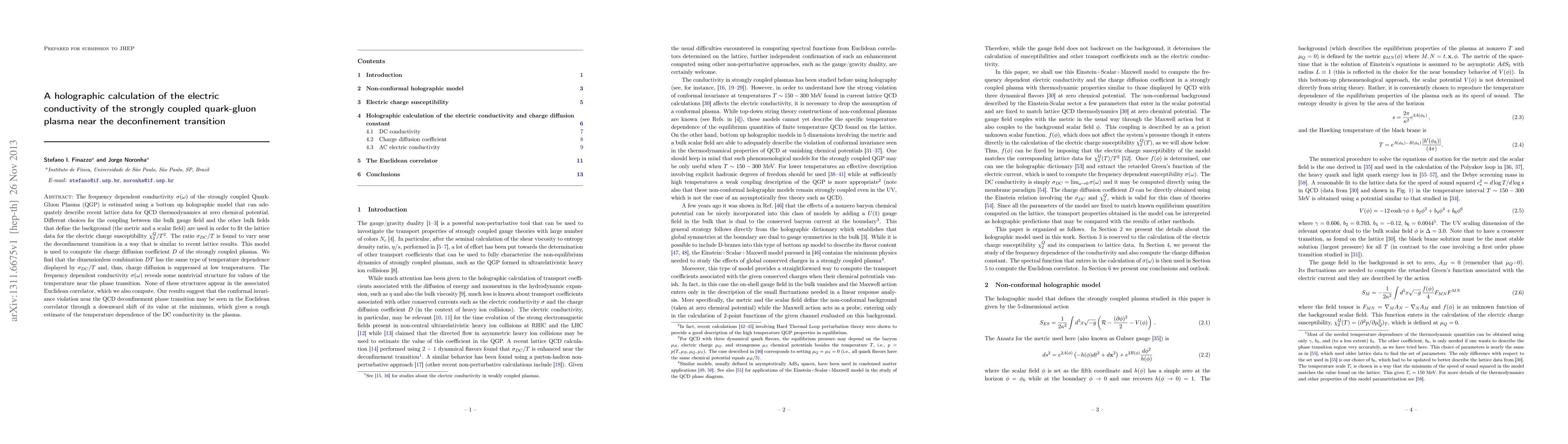The frequency dependent conductivity $\sigma(\omega)$ of the strongly coupled Quark-Gluon Plasma (QGP) is estimated using a bottom up holographic model that can adequately describe recent lattice data for QCD thermodynamics at zero chemical potential. Different choices for the coupling between the bulk gauge field and the other bulk fields that define the background (the metric and a scalar field) are used in order to fit the lattice data for the electric charge susceptibility $\chi_2^Q/T^2$. The ratio $\sigma_{DC}/T$ is found to vary near the deconfinement transition in a way that is similar to recent lattice results. This model is used to compute the charge diffusion coefficient $D$ of the strongly coupled plasma. We find that the dimensionless combination $DT$ has the same type of temperature dependence displayed by $\sigma_{DC}/T$ and, thus, charge diffusion is suppressed at low temperatures. The frequency dependent conductivity $\sigma(\omega)$ reveals some nontrivial structure for values of the temperature near the phase transition. None of these structures appear in the associated Euclidean correlator, which we also compute. Our results suggest that the conformal invariance violation near the QCD deconfinement phase transition may be seen in the Euclidean correlator through a downward shift of its value at the minimum, which gives a rough estimate of the temperature dependence of the DC conductivity in the plasma.