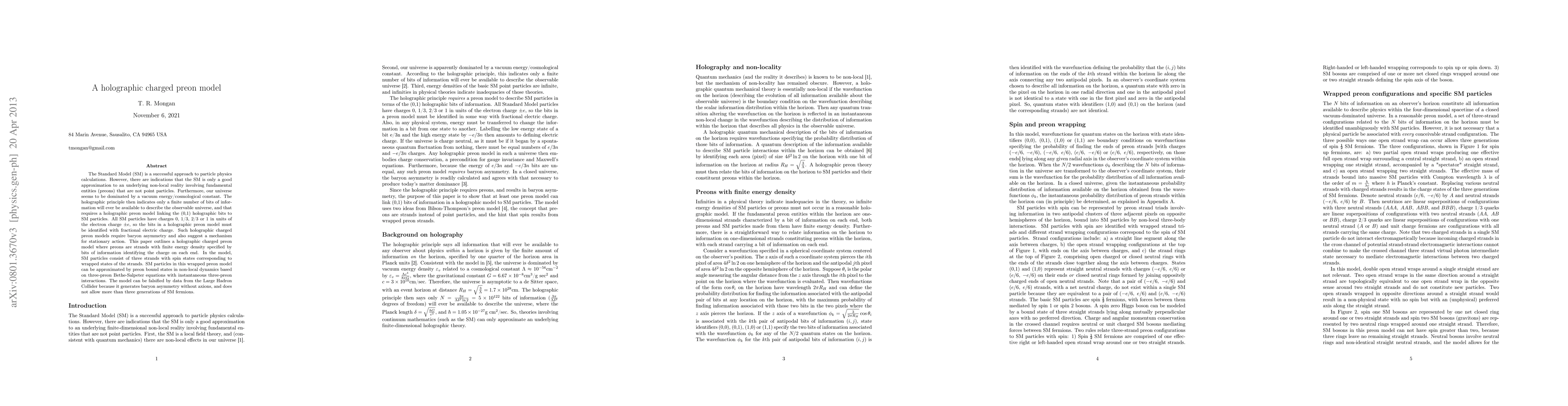The paper proposes a holographic charged preon model where preons are strands with finite energy density, specified by bits of information identifying the charge on each end. It uses three-preon Bethe-Salpeter equations with instantaneous three-preon interactions to approximate Standard Model (SM) particles.