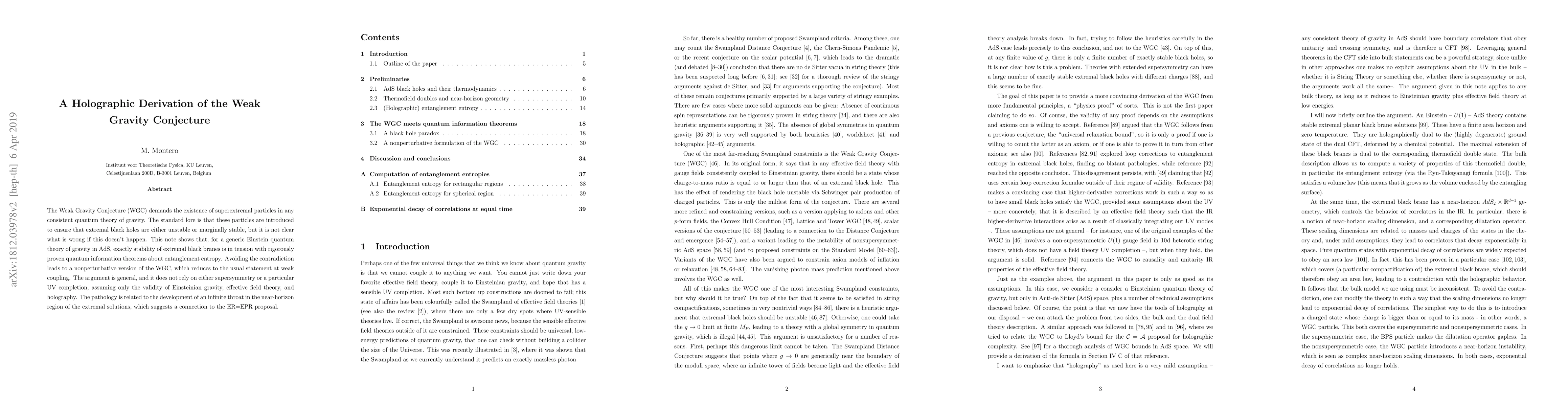 The Weak Gravity Conjecture (WGC) demands the existence of superextremal particles in any consistent quantum theory of gravity. The standard lore is that these particles are introduced to ensure that extremal black holes are either unstable or marginally stable, but it is not clear what is wrong if this doesn't happen. This note shows that, for a generic Einstein quantum theory of gravity in AdS, exactly stability of extremal black branes is in tension with rigorously proven quantum information theorems about entanglement entropy. Avoiding the contradiction leads to a nonperturbative version of the WGC, which reduces to the usual statement at weak coupling. The argument is general, and it does not rely on either supersymmetry or a particular UV completion, assuming only the validity of Einsteinian gravity, effective field theory, and holography. The pathology is related to the development of an infinite throat in the near-horizon region of the extremal solutions, which suggests a connection to the ER=EPR proposal.