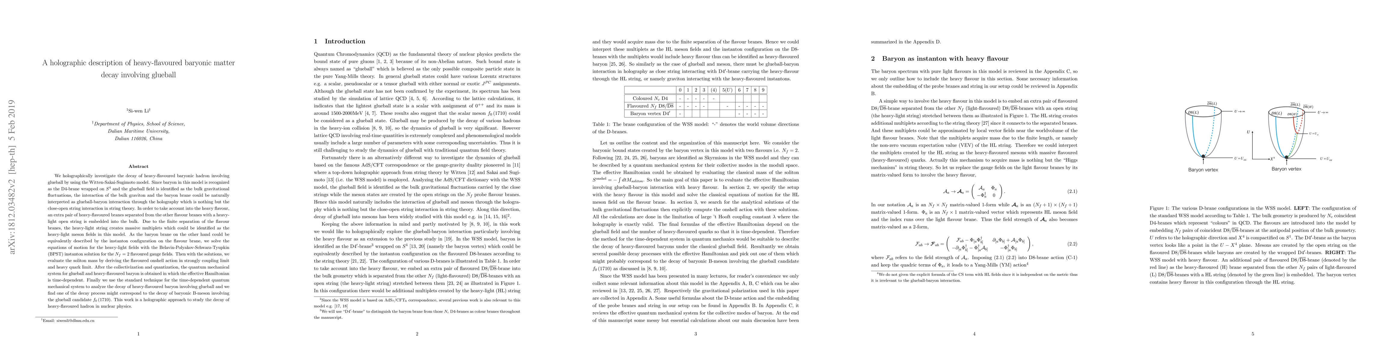We holographically investigate the decay of heavy-flavoured baryonic hadron involving glueball by using the Witten-Sakai-Sugimoto model. Since baryon in this model is recognized as the D4-brane wrapped on $S^{4}$ and the glueball field is identified as the bulk gravitational fluctuations, the interaction of the bulk graviton and the baryon brane could be naturally interpreted as glueball-baryon interaction through the holography which is nothing but the close-open string interaction in string theory. In order to take account into the heavy flavour, an extra pair of heavy-flavoured branes separated from the other flavour branes with a heavy-light open string is embedded into the bulk. Due to the finite separation of the flavour branes, the heavy-light string creates massive multiplets which could be identified as the heavy-light meson fields in this model. As the baryon brane on the other hand could be equivalently described by the instanton configuration on the flavour brane, we solve the equations of motion for the heavy-light fields with the Belavin-Polyakov-Schwarz-Tyupkin (BPST) instanton solution for the $N_{f}=2$ flavoured gauge fields. Then with the solutions, we evaluate the soliton mass by deriving the flavoured onshell action in strongly coupling limit and heavy quark limit. After the collectivization and quantization, the quantum mechanical system for glueball and heavy-flavoured baryon is obtained in which the effective Hamiltonian is time-dependent. Finally we use the standard technique for the time-dependent quantum mechanical system to analyze the decay of heavy-flavoured baryon involving glueball and we find one of the decay process might correspond to the decay of baryonic B-meson involving the glueball candidate $f_{0}\left(1710\right)$. This work is a holographic approach to study the decay of heavy-flavoured hadron in nuclear physics.