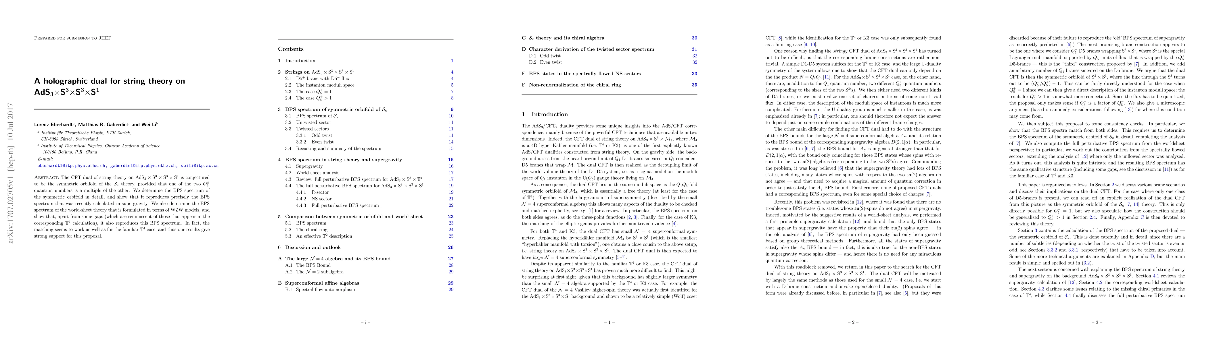 The paper proposes a holographic dual for string theory on $\mathrm{AdS}_3 \times \mathrm{S}^3 \times \mathrm{S}^3 \times \mathrm{S}^1$ by analyzing the BPS spectrum of its symmetric orbifold, which matches the supergravity calculation. The matching of BPS spectra supports the conjectured dual between the symmetric orbifold and the string theory.