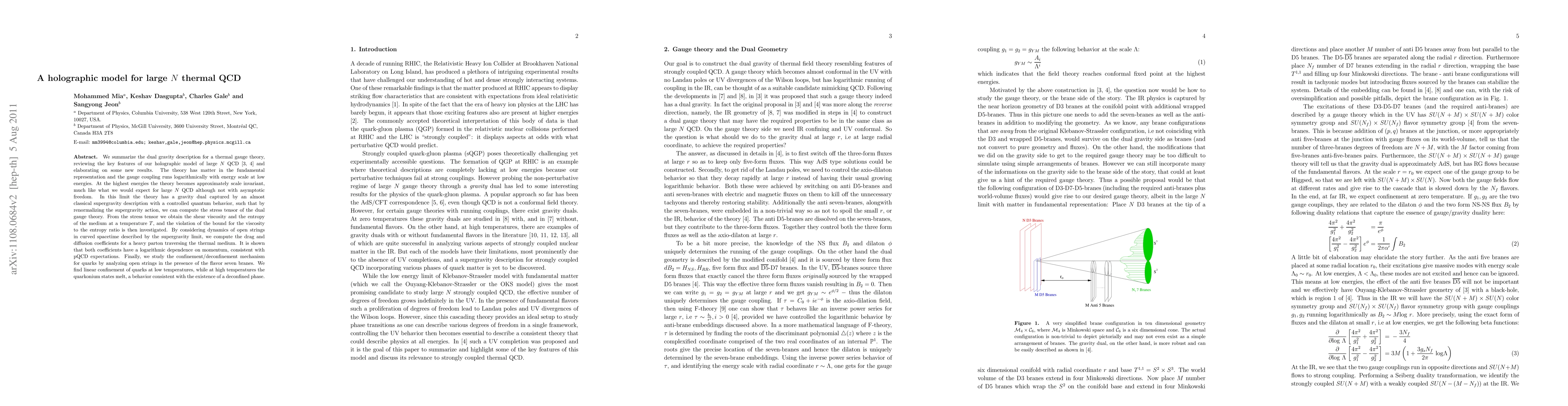 We summarize the dual gravity description for a thermal gauge theory, reviewing the key features of our holographic model of large N QCD and elaborating on some new results.The theory has matter in the fundamental representation and the gauge coupling runs logarithmically with energy scale at low energies. At the highest energies the theory becomes approximately scale invariant, much like what we would expect for large N QCD although not with asymptotic freedom. In this limit the theory has a gravity dual captured by an almost classical supergravity description with a controlled quantum behavior, such that by renormalizing the supergravity action, we can compute the stress tensor of the dual gauge theory. From the stress tensor we obtain the shear viscosity and the entropy of the medium at a temperature T, and the violation of the bound for the viscosity to the entropy ratio is then investigated. By considering dynamics of open strings in curved spacetime described by the supergravity limit, we compute the drag and diffusion coefficients for a heavy parton traversing the thermal medium. It is shown that both coefficients have a logarithmic dependence on momentum, consistent with pQCD expectations. Finally, we study the confinement/deconfinement mechanism for quarks by analyzing open strings in the presence of the flavor seven branes. We find linear confinement of quarks at low temperatures, while at high temperatures the quarkonium states melt, a behavior consistent with the existence of a deconfined phase.