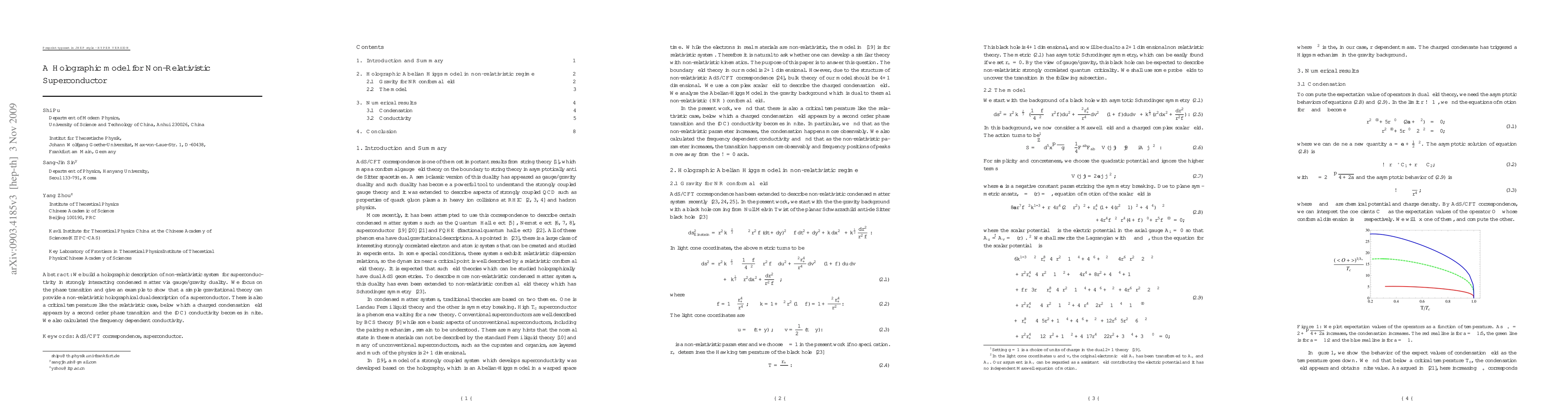This paper constructs a holographic model for non-relativistic superconductors using gauge/gravity duality, demonstrating a phase transition and critical temperature akin to relativistic systems, where a charged condensation field emerges below a certain temperature, leading to infinite DC conductivity and frequency-dependent conductivity.