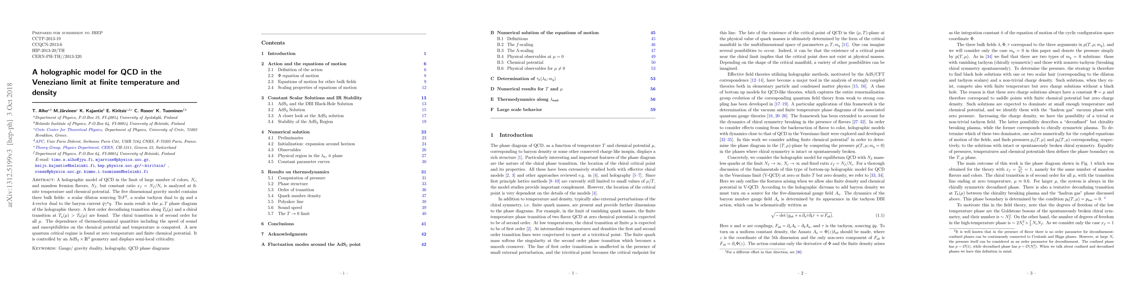 A holographic model of QCD in the limit of large number of colors, $N_c$, and massless fermion flavors, $N_f$, but constant ratio $x_f=N_f/N_c$ is analyzed at finite temperature and chemical potential. The five dimensional gravity model contains three bulk fields: a scalar dilaton sourcing ${\rm Tr}F^2$, a scalar tachyon dual to $\bar qq$ and a 4-vector dual to the baryon current $\bar q \gamma^{\mu} q$. The main result is the $\mu,T$ phase diagram of the holographic theory. A first order deconfining transition along $T_h(\mu)$ and a chiral transition at $T_\chi(\mu)>T_h(\mu)$ are found. The chiral transition is of second order for all $\mu$. The dependence of thermodynamical quantities including the speed of sound and susceptibilities on the chemical potential and temperature is computed. A new quantum critical regime is found at zero temperature and finite chemical potential. It is controlled by an AdS$_2\times R^3$ geometry and displays semi-local criticality.