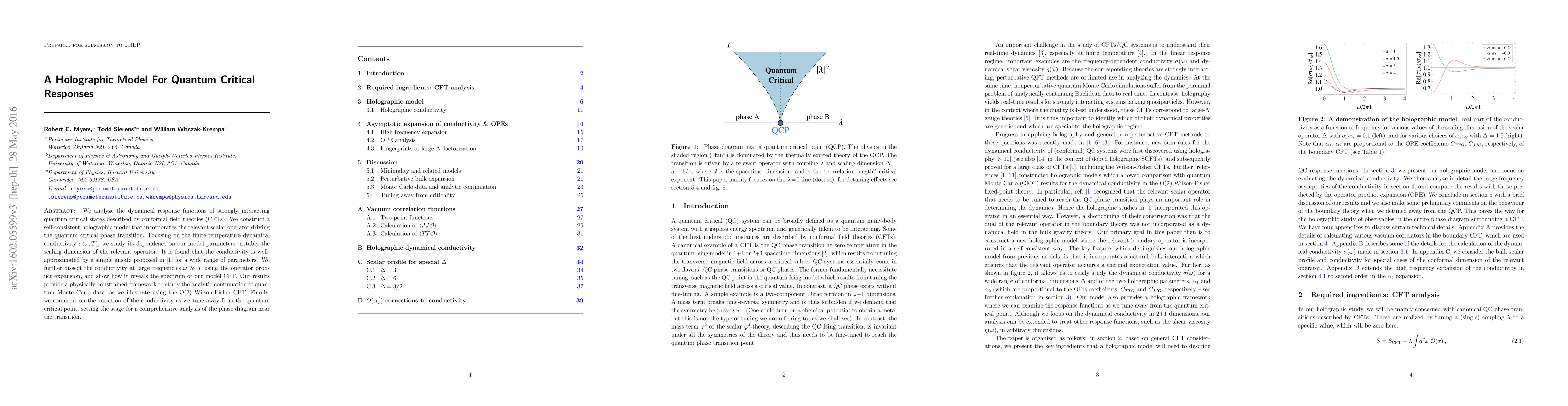 We analyze the dynamical response functions of strongly interacting quantum critical states described by conformal field theories (CFTs). We construct a self-consistent holographic model that incorporates the relevant scalar operator driving the quantum critical phase transition. Focusing on the finite temperature dynamical conductivity $\sigma(\omega,T)$, we study its dependence on our model parameters, notably the scaling dimension of the relevant operator. It is found that the conductivity is well-approximated by a simple ansatz proposed by Katz et al [1] for a wide range of parameters. We further dissect the conductivity at large frequencies $\omega >> T$ using the operator product expansion, and show how it reveals the spectrum of our model CFT. Our results provide a physically-constrained framework to study the analytic continuation of quantum Monte Carlo data, as we illustrate using the O(2) Wilson-Fisher CFT. Finally, we comment on the variation of the conductivity as we tune away from the quantum critical point, setting the stage for a comprehensive analysis of the phase diagram near the transition.