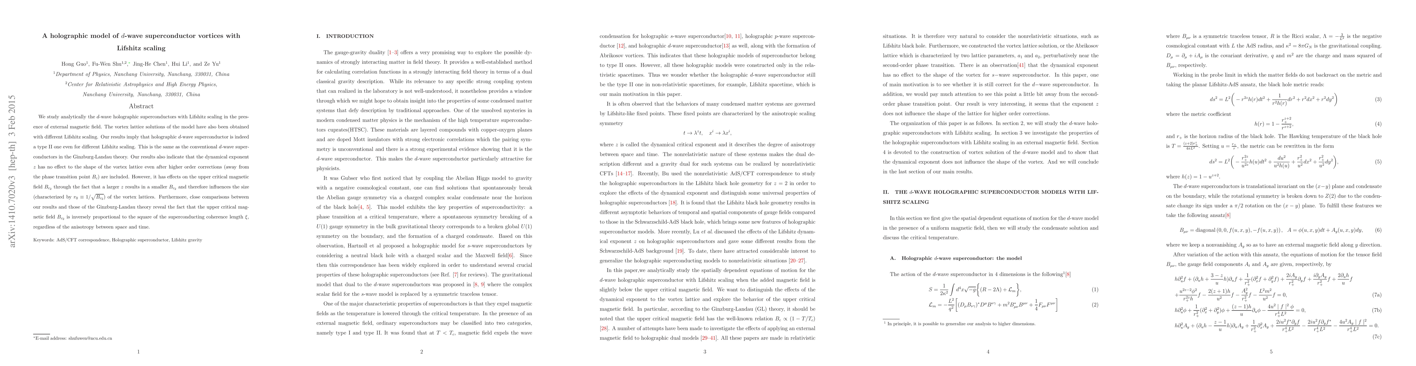 This paper analytically investigates $d$-wave holographic superconductors with Lifshitz scaling under an external magnetic field, finding that the model behaves as a type II superconductor akin to conventional $d$-wave superconductors. The study reveals that the dynamical exponent $z$ affects the upper critical magnetic field $B_{c_2}$ but does not alter the vortex lattice shape.