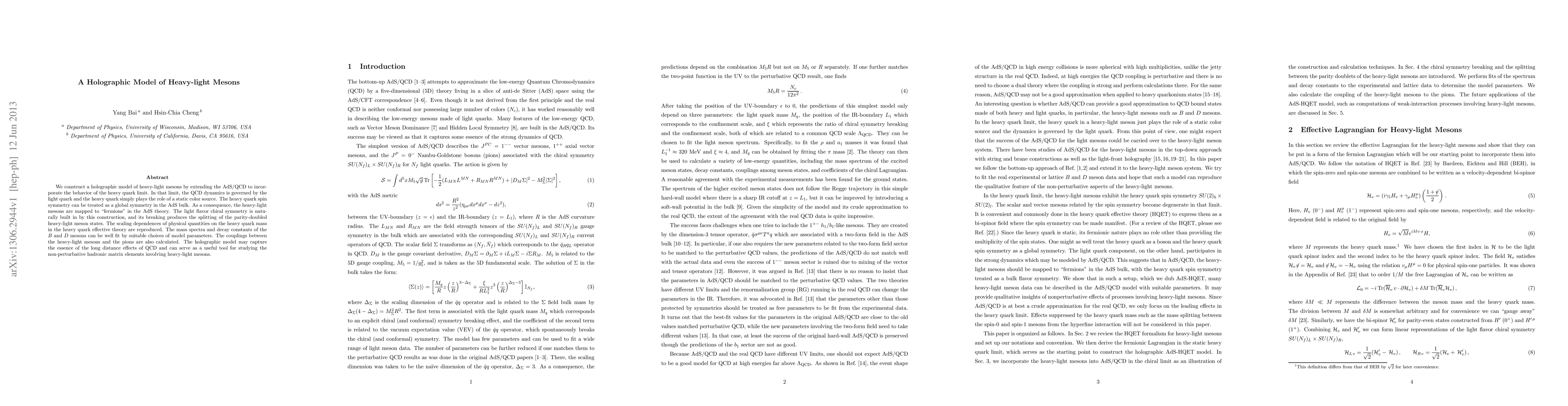 This paper constructs a holographic model of heavy-light mesons using AdS/QCD, capturing the behavior of heavy quarks as static color sources. The model reproduces the mass spectra and decay constants of B and D mesons, and provides a useful tool for studying non-perturbative QCD effects.