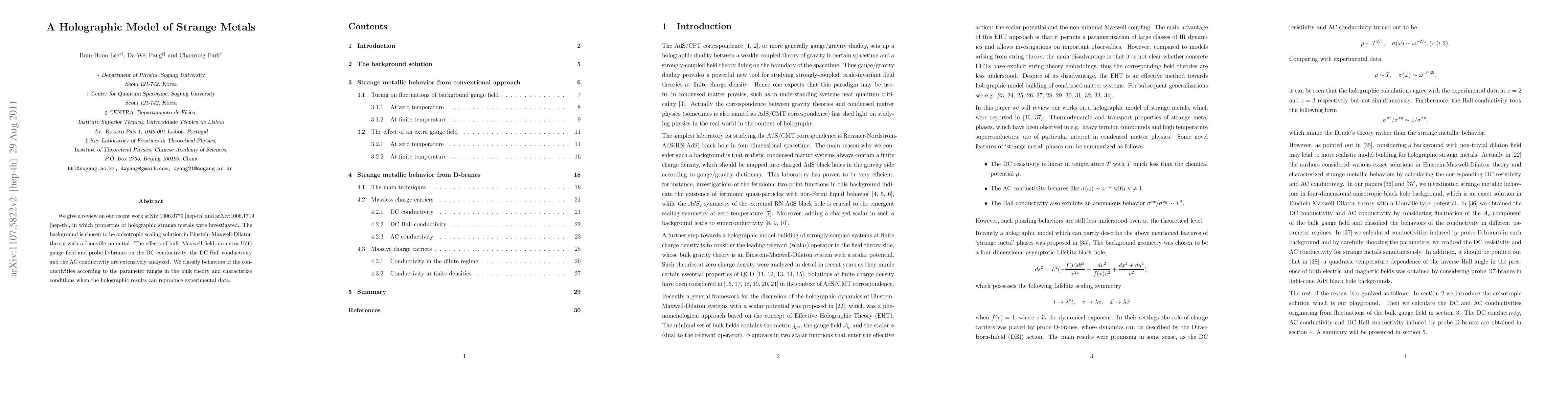 This paper reviews the authors' studies on holographic strange metals using an anisotropic scaling solution in Einstein-Maxwell-Dilaton theory, analyzing the impact of bulk Maxwell fields and extra gauge fields on conductivities. The findings classify conductivity behaviors and identify conditions where holographic results match experimental data.