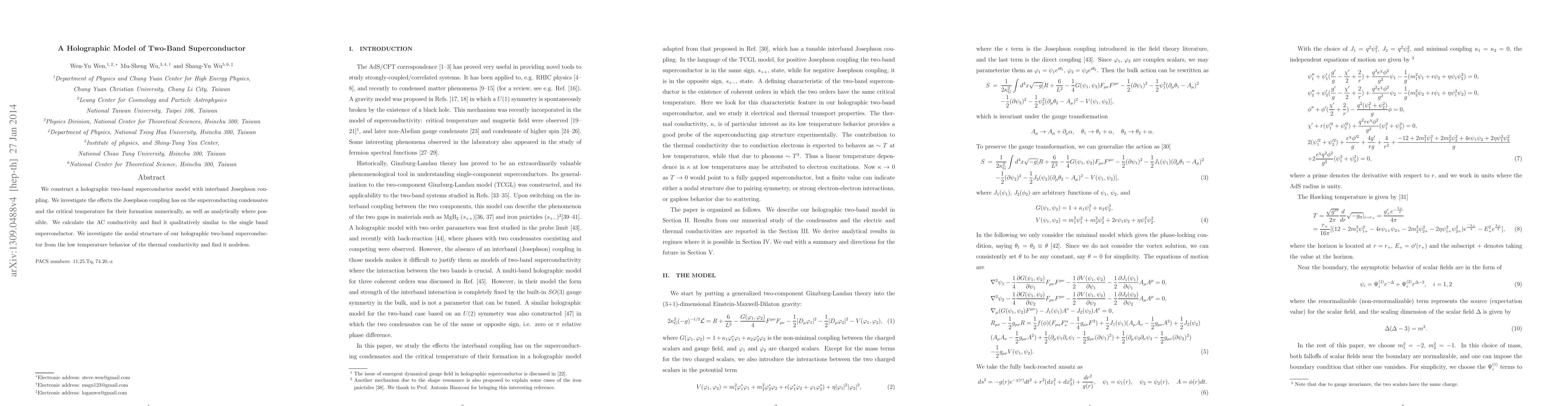 This paper constructs a holographic two-band superconductor model with interband Josephson coupling, exploring its effects on superconducting condensates and critical temperature, and finds AC conductivity similar to single-band superconductors, with a nodeless nodal structure based on thermal conductivity analysis.