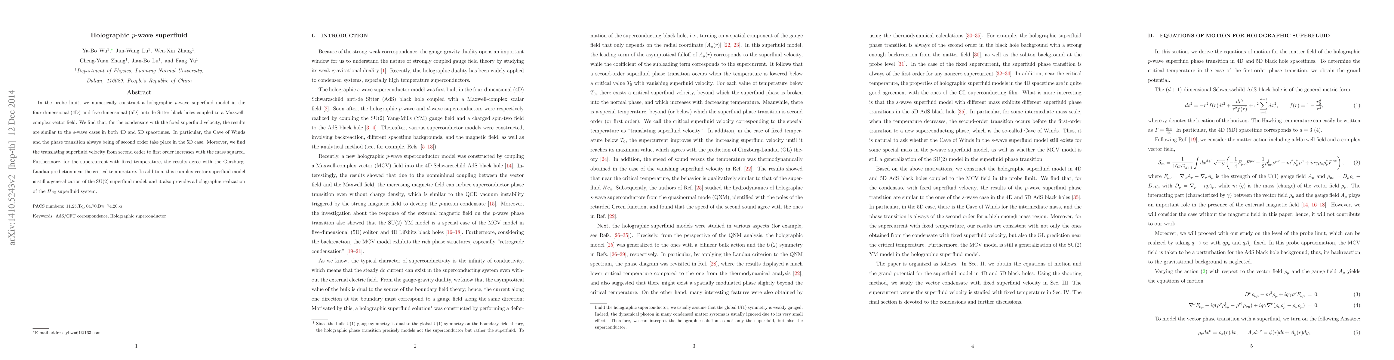 This paper constructs a holographic p-wave superfluid model in 4D and 5D AdS black holes, finding similarities to s-wave cases. It identifies second-order phase transitions in the 5D case and validates the GL prediction near critical temperature, generalizing the SU(2) superfluid model and providing a holographic realization of the $He_3$ superfluid system.