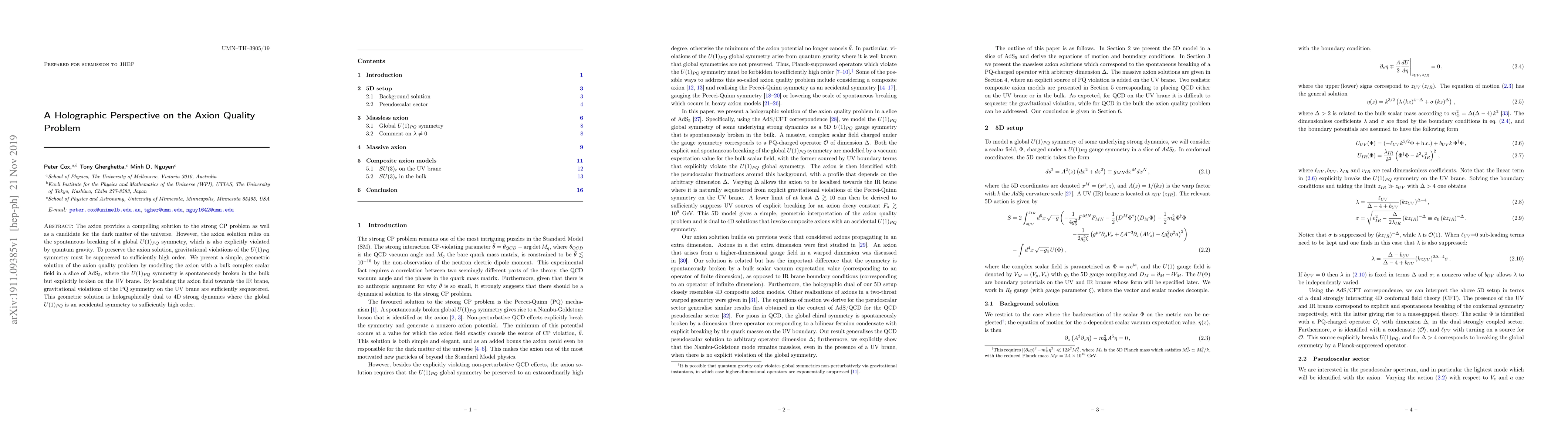 The axion provides a compelling solution to the strong CP problem as well as a candidate for the dark matter of the universe. However, the axion solution relies on the spontaneous breaking of a global $U(1)_{PQ}$ symmetry, which is also explicitly violated by quantum gravity. To preserve the axion solution, gravitational violations of the $U(1)_{PQ}$ symmetry must be suppressed to sufficiently high order. We present a simple, geometric solution of the axion quality problem by modelling the axion with a bulk complex scalar field in a slice of AdS$_5$, where the $U(1)_{PQ}$ symmetry is spontaneously broken in the bulk but explicitly broken on the UV brane. By localising the axion field towards the IR brane, gravitational violations of the PQ symmetry on the UV brane are sufficiently sequestered. This geometric solution is holographically dual to 4D strong dynamics where the global $U(1)_{PQ}$ is an accidental symmetry to sufficiently high order.