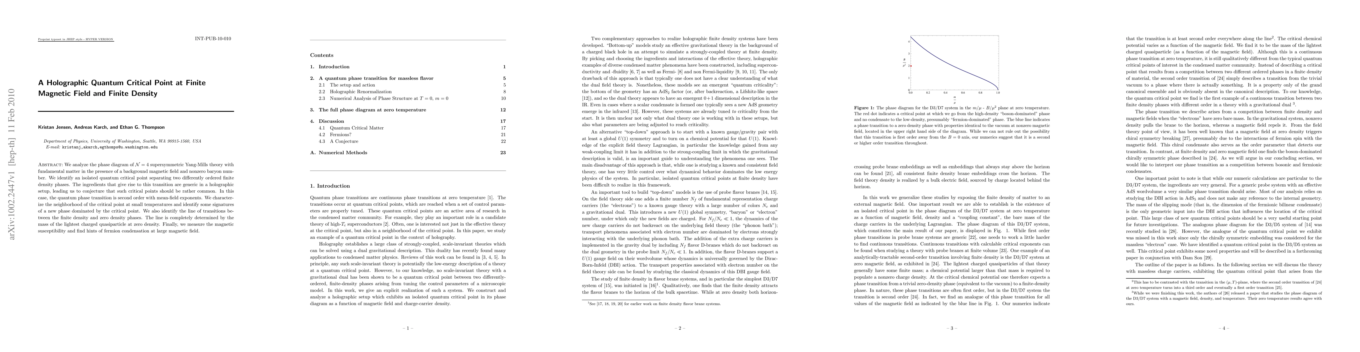 This paper identifies a holographic quantum critical point in N=4 supersymmetric Yang-Mills theory under a magnetic field and nonzero baryon density, distinguishing it from other phases. The critical point is second-order with mean-field exponents, and the study reveals signatures of a new phase near the criticality, along with the transition line determined by the lightest charged quasiparticle's mass.