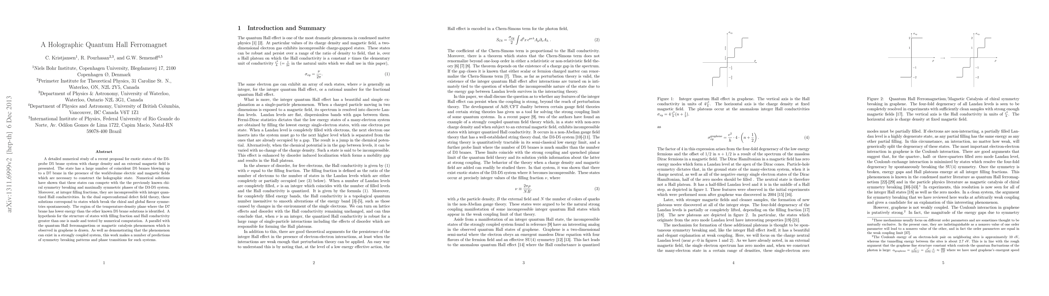 A detailed numerical study of a recent proposal for exotic states of the D3-probe D5 brane system with charge density and an external magnetic field is presented. The state has a large number of coincident D5 branes blowing up to a D7 brane in the presence of the worldvolume electric and magnetic fields which are necessary to construct the holographic state. Numerical solutions have shown that these states can compete with the the previously known chiral symmetry breaking and maximally symmetric phases of the D3-D5 system. Moreover, at integer filling fractions, they are incompressible with integer quantized Hall conductivities. In the dual superconformal defect field theory, these solutions correspond to states which break the chiral and global flavor symmetries spontaneously. The region of the temperature-density plane where the D7 brane has lower energy than the other known D5 brane solutions is identified. A hypothesis for the structure of states with filling fraction and Hall conductivity greater than one is made and tested by numerical computation. A parallel with the quantum Hall ferromagnetism or magnetic catalysis phenomenon which is observed in graphene is drawn. As well as demonstrating that the phenomenon can exist in a strongly coupled system, this work makes a number of predictions of symmetry breaking patterns and phase transitions for such systems.