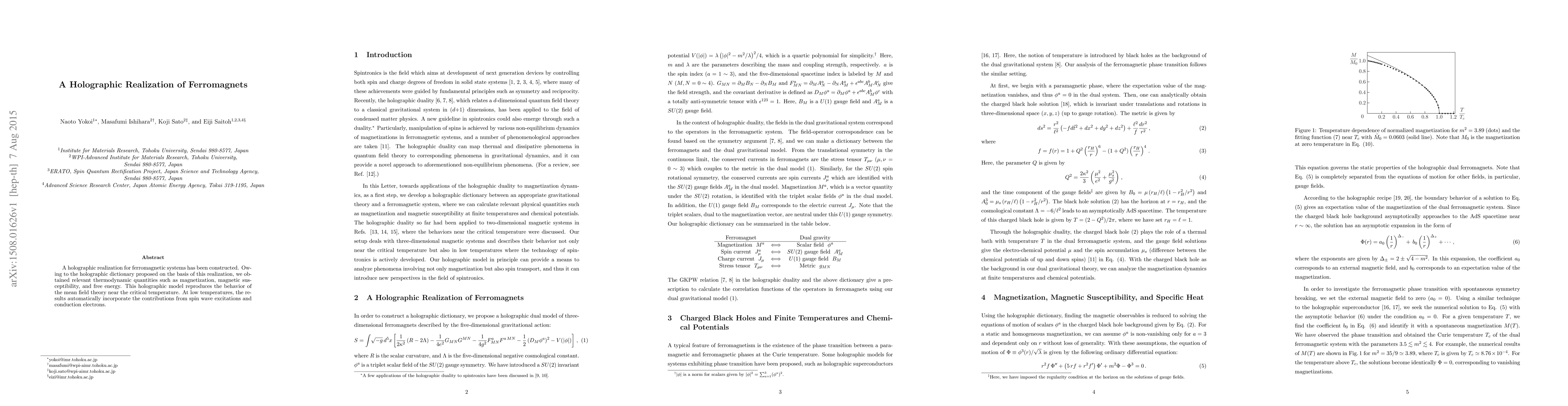 This paper constructs a holographic model for ferromagnetic systems, providing a holographic dictionary to derive thermodynamic quantities like magnetization and magnetic susceptibility. The model aligns with mean field theory near critical temperature and includes spin wave and electron contributions at low temperatures.