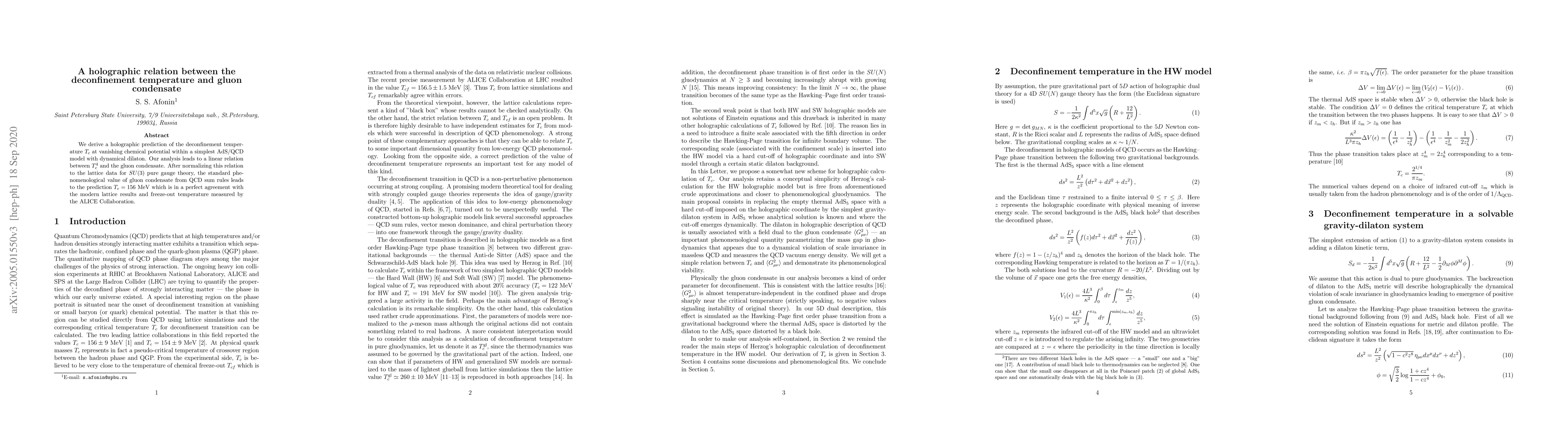 This research establishes a holographic relation predicting the deconfinement temperature $T_c$ in an AdS/QCD model, finding a linear link between $T_c^4$ and the gluon condensate, which aligns with lattice data and modern experimental results, confirming $T_c=156$ MeV.