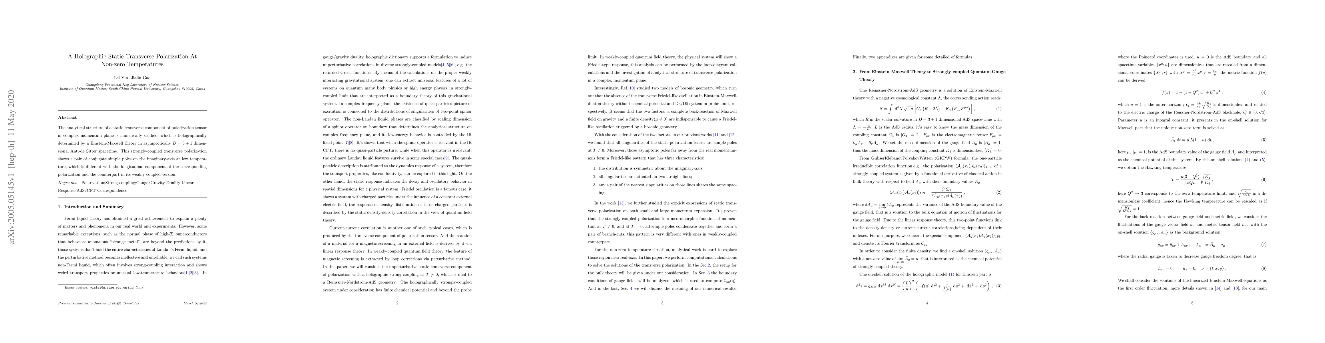 Researchers study static transverse polarization in Anti-de Sitter spacetime at non-zero temperatures, finding a unique pair of conjugate simple poles on the imaginary-axis.