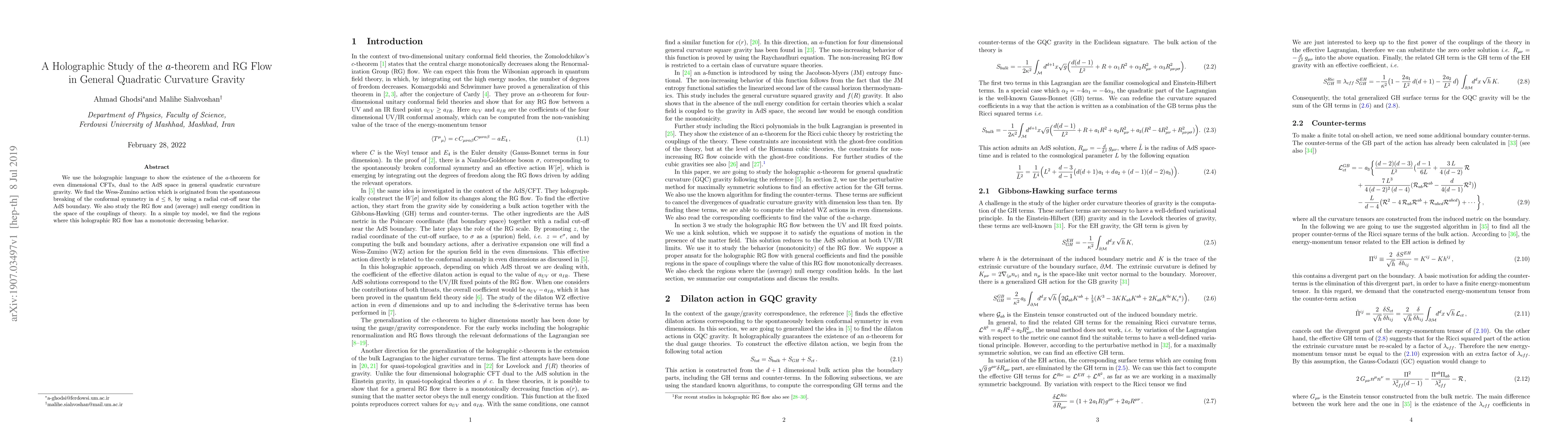 We use the holographic language to show the existence of the $a$-theorem for even dimensional CFTs, dual to the AdS space in general quadratic curvature gravity. We find the Wess-Zumino action which is originated from the spontaneous breaking of the conformal symmetry in $d\leq 8$, by using a radial cut-off near the AdS boundary. We also study the RG flow and (average) null energy condition in the space of the couplings of theory. In a simple toy model, we find the regions where this holographic RG flow has a monotonic decreasing behavior.