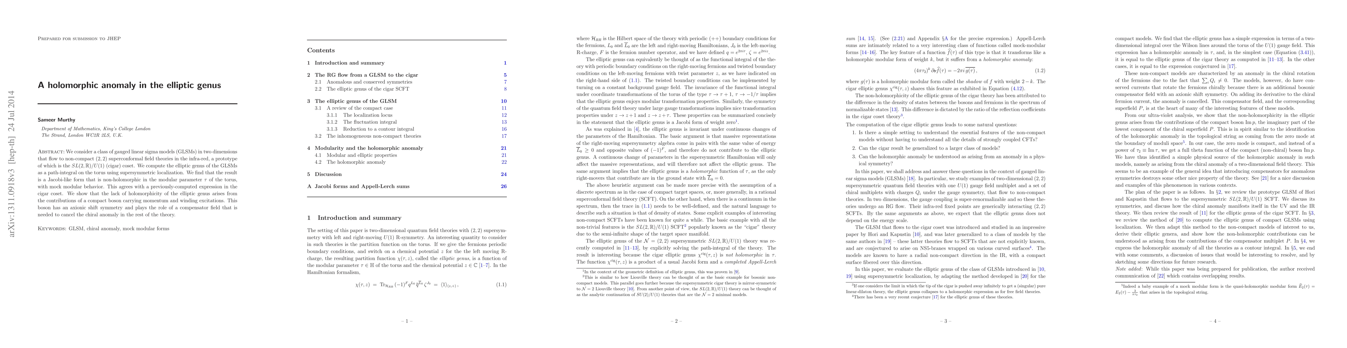 We consider a class of gauged linear sigma models (GLSMs) in two dimensions that flow to non-compact (2,2) superconformal field theories in the infra-red, a prototype of which is the SL(2,\IR)/U(1) (cigar) coset. We compute the elliptic genus of the GLSMs as a path-integral on the torus using supersymmetric localization. We find that the result is a Jacobi-like form that is non-holomorphic in the modular parameter $\tau$ of the torus, with mock modular behavior. This agrees with a previously-computed expression in the cigar coset. We show that the lack of holomorphicity of the elliptic genus arises from the contributions of a compact boson with momentum and winding around the torus. This boson has an axionic shift symmetry and plays the role of a compensator field that is needed to cancel the chiral anomaly in the rest of the theory.
