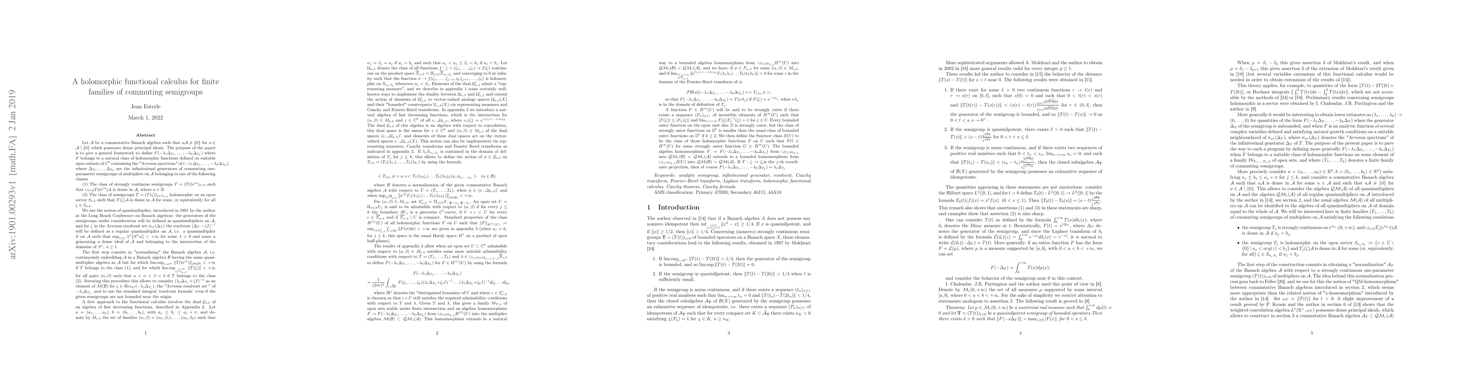 Let A be a commutative Banach algebra such that uA = {0} for u $\in$ A \ {0} which possesses dense principal ideals. The purpose of the paper is to give a general framework to define F (--$\lambda$1$\Delta$T 1 ,. .. , --$\lambda$ k $\Delta$T k) where F belongs to a natural class of holomorphic functions defined on suitable open subsets of C k containing the "Arveson spectrum" of (--$\lambda$1$\Delta$T 1 ,. .. , --$\lambda$ k $\Delta$T k), where $\Delta$T 1 ,. .. , $\Delta$T k are the infinitesimal generators of commuting one-parameter semigroups of multipliers on A belonging to one of the following classes (1) The class of strongly continous semigroups T = (T (te ia)t>0 such that $\cup$t>0T (te ia)A is dense in A, where a $\in$ R. (2) The class of semigroups T = (T ($\zeta$)) $\zeta$$\in$S a,b holomorphic on an open sector S a,b such that T ($\zeta$)A is dense in A for some, or equivalently for all $\zeta$ $\in$ S a,b. We use the notion of quasimultiplier, introduced in 1981 by the author at the Long Beach Conference on Banach algebras: the generators of the semigroups under consideration will be defined as quasimultipliers on A, and for $\zeta$ in the Arveson resolvent set $\sigma$ar($\Delta$T) the resolvent ($\Delta$T -- $\zeta$I) --1 will be defined as a regular quasimultiplier on A, i.e. a quasimultiplier S on A such that sup n$\ge$1 $\lambda$ n S n u < +$\infty$ for some $\lambda$ > 0 and some u generating a dense ideal of A and belonging to the intersection of the domains of S n , n $\ge$ 1. The first step consists in "normalizing" the Banach algebra A, i.e. continuously embedding A in a Banach algebra B having the same quasi-multiplier algebra as A but for which lim sup t$\rightarrow$0 + T (te ia) M(B) < +$\infty$ if T belongs to the class (1), and for which lim sup $\zeta$$\rightarrow$0 $\zeta$$\in$S $\alpha$,$\beta$ T ($\zeta$) < +$\infty$ for all pairs ($\alpha$, $\beta$) such that a < $\alpha$ < $\beta$ < b if T belongs to the class (2). Iterating this procedure this allows to consider ($\lambda$j$\Delta$T j + $\zeta$I) --1 as an element of M(B) for $\zeta$ $\in$ Resar(--$\lambda$j$\Delta$T j), the "Arveson resolvent set " of --$\lambda$j$\Delta$T j , and to use the standard integral 'resolvent formula' even if the given semigroups are not bounded near the origin. A first approach to the functional calculus involves the dual G a,b of an algebra of fast decreasing functions, described in Appendix 2. Let a = (a1,. .. , a k), b = (b1,. .. , b k), with aj $\le$ bj $\le$ aj + $\pi$, and denote by M a,b the set of families ($\alpha$, $\beta$) = ($\alpha$1, $\beta$1),. .. , ($\alpha$ k , $\beta$ k) such that 1
