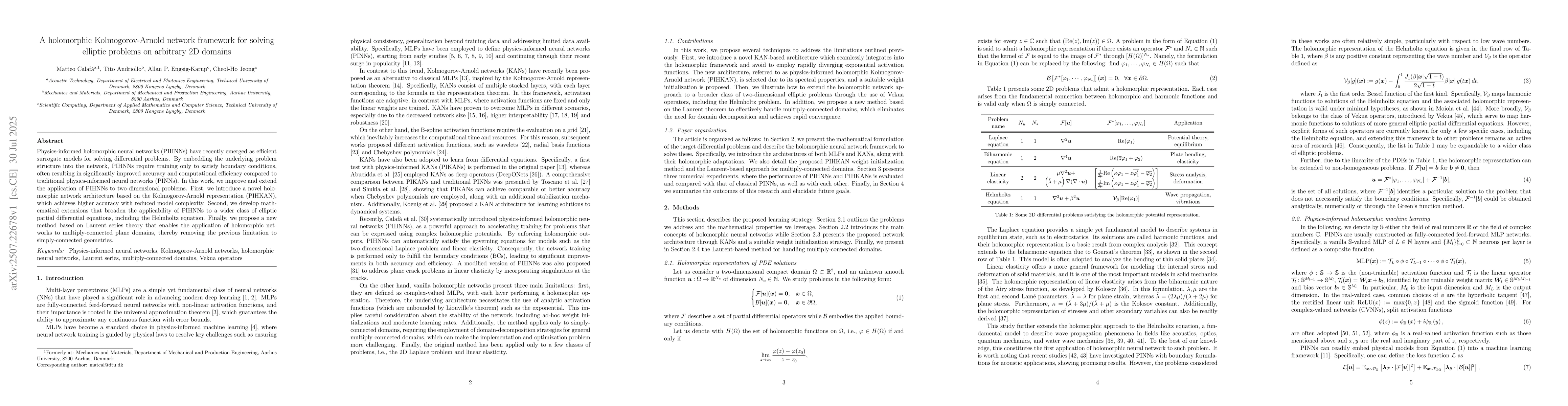 The paper presents a novel holomorphic network architecture (PIHKAN) based on the Kolmogorov-Arnold representation, along with mathematical extensions and a new method using Laurent series for multiply-connected domains.