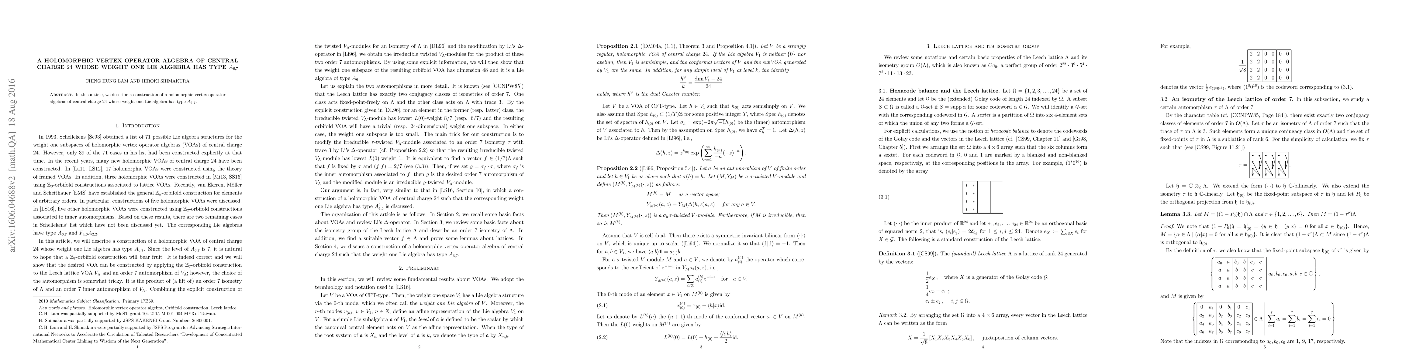 Summary: This paper constructs a holomorphic vertex operator algebra with a central charge of 24 and a weight one Lie algebra of type $A_{6,7}$, contributing to the understanding of vertex operator algebras and their associated Lie algebras.