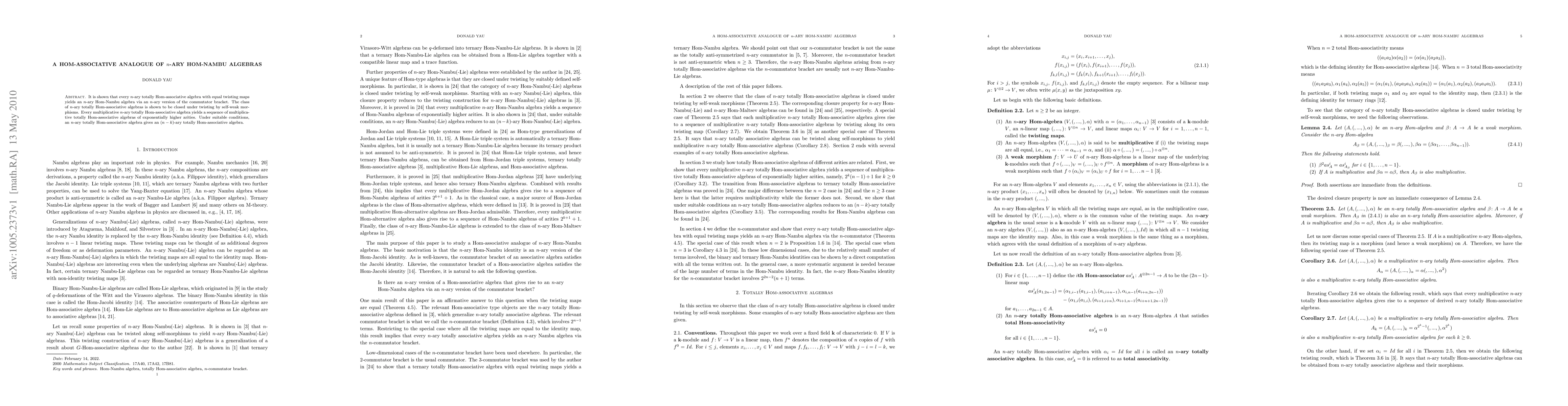 It is shown that every n-ary totally Hom-associative algebra with equal twisting maps yields an n-ary Hom-Nambu algebra via an n-ary version of the commutator bracket. The class of n-ary totally Hom-associative algebras is shown to be closed under twisting by self-weak morphisms. Every multiplicative n-ary totally Hom-associative algebra yields a sequence of multiplicative totally Hom-associative algebras of exponentially higher arities. Under suitable conditions, an n-ary totally Hom-associative algebra gives an (n-k)-ary totally Hom-associative algebra.
