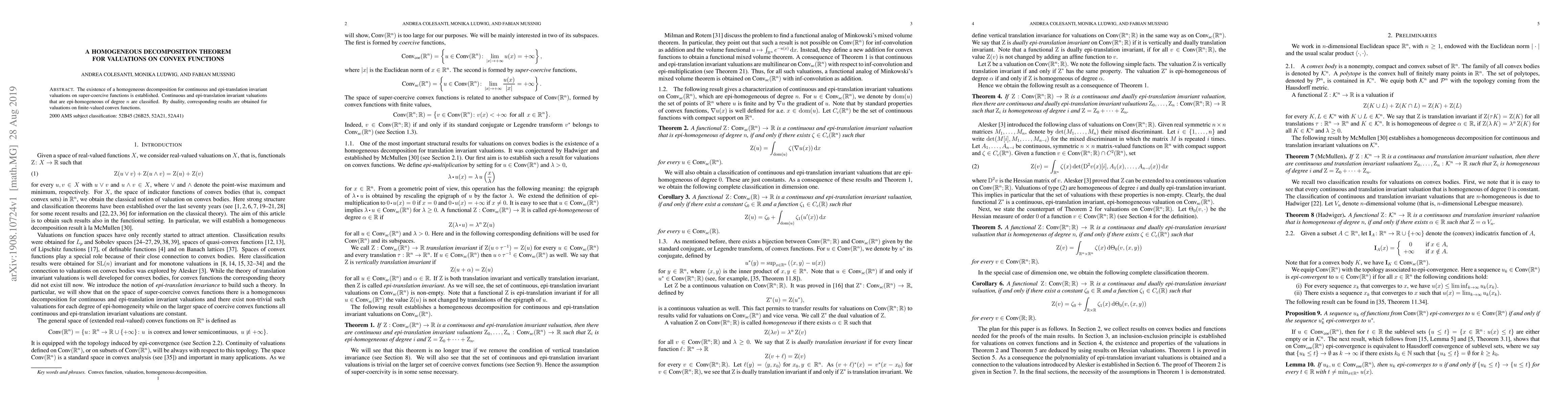 The paper establishes a homogeneous decomposition for continuous and epi-translation invariant valuations on super-coercive functions and classifies these valuations. Dual results are also obtained for valuations on finite-valued convex functions.