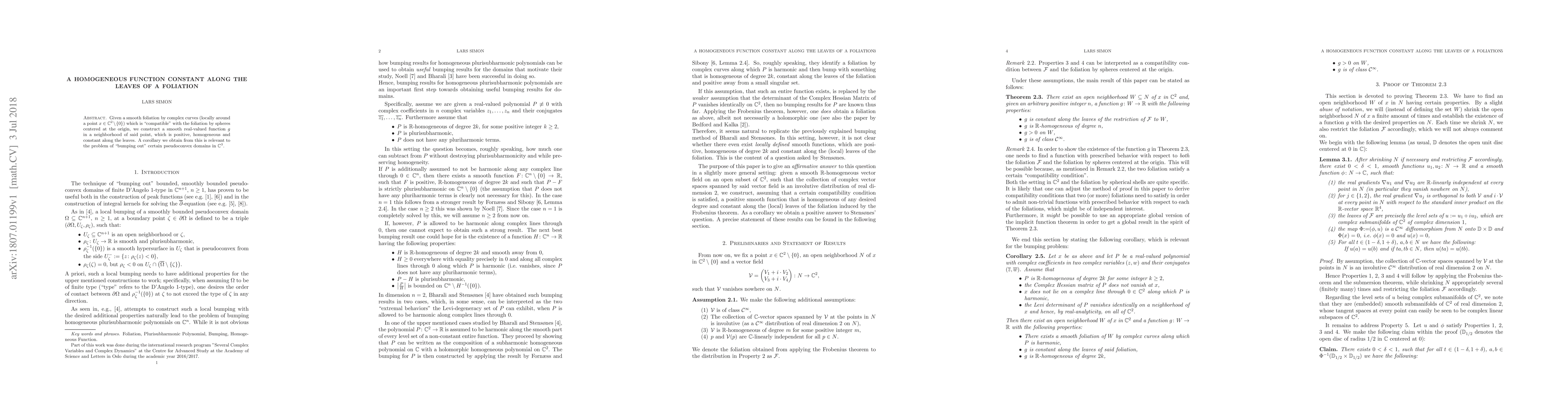 Given a smooth foliation by complex curves (locally around a point $x\in\mathbb{C}^2\setminus\{0\}$) which is "compatible" with the foliation by spheres centered at the origin, we construct a smooth real-valued function $g$ in a neighborhood of said point, which is positive, homogeneous and constant along the leaves. A corollary we obtain from this is relevant to the problem of "bumping out" certain pseudoconvex domains in $\mathbb{C}^3$.