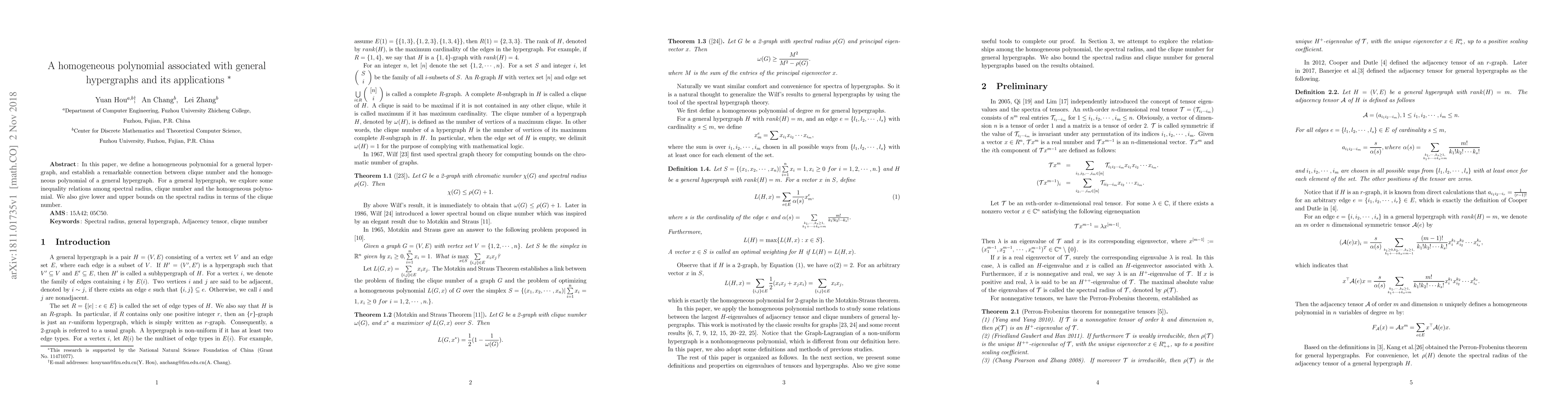 A new homogeneous polynomial is defined for general hypergraphs, showing a connection between clique number and spectral radius, with implications for bounds on the spectral radius in terms of clique number.