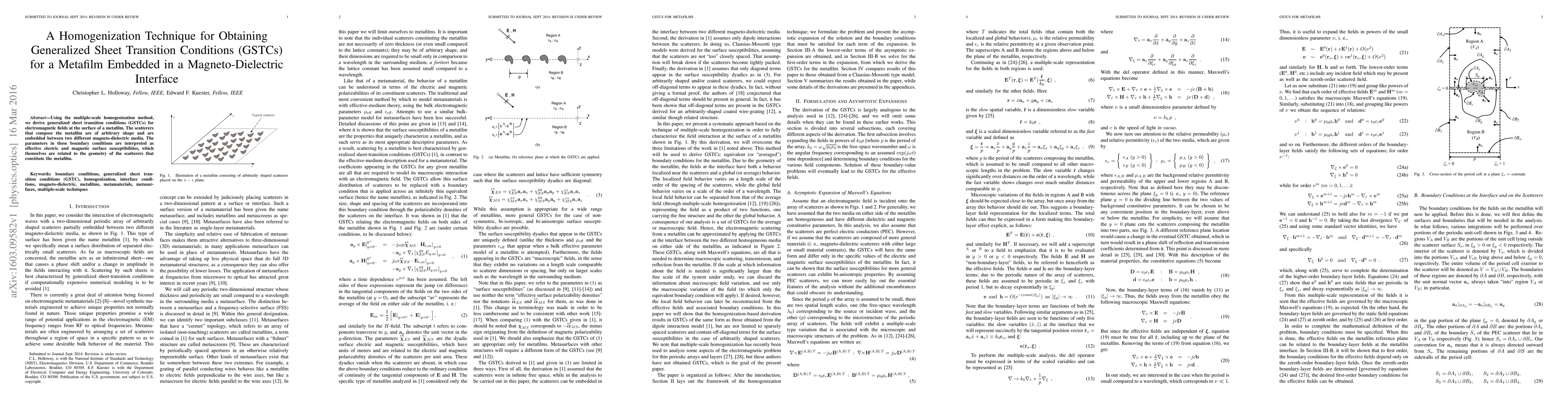 Using the multiple-scale homogenization method, we derive generalized sheet transition conditions (GSTCs) for electromagnetic fields at the surface of a metafilm. The scatterers that compose the metafilm are of arbitrary shape and are embedded between two different magneto-dielectric media. The parameters in these boundary conditions are interpreted as effective electric and magnetic surface susceptibilities, which themselves are related to the geometry of the scatterers that constitute the metafilm.