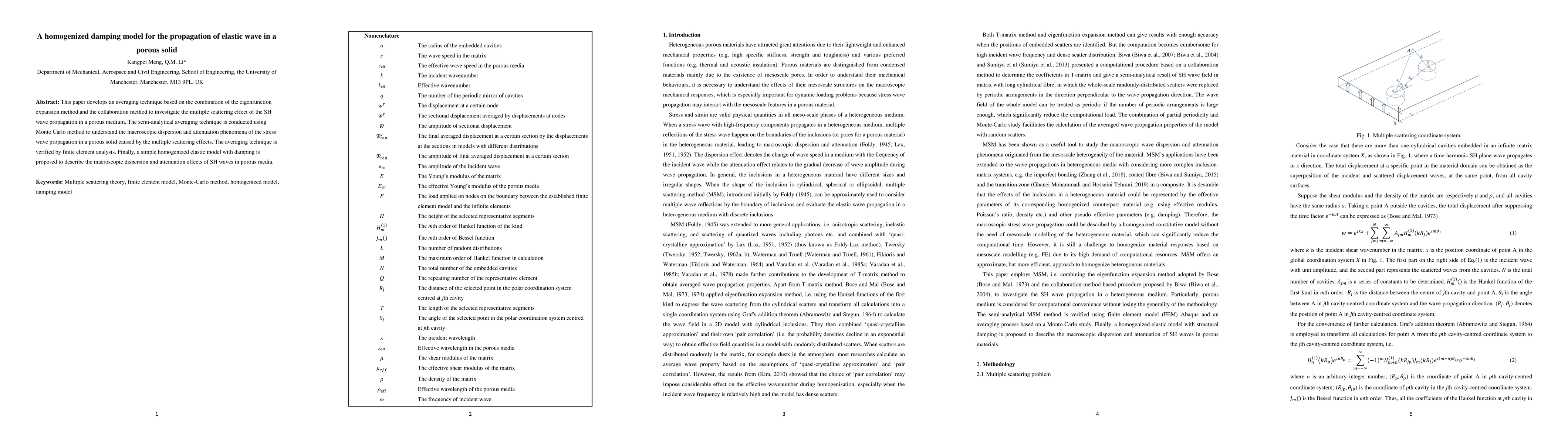 This paper proposes an averaging technique combining eigenfunction expansion and the collaboration method to study SH wave propagation in a porous medium, validated by finite element analysis. A homogenized damping model is developed to describe macroscopic dispersion and attenuation effects due to multiple scattering.