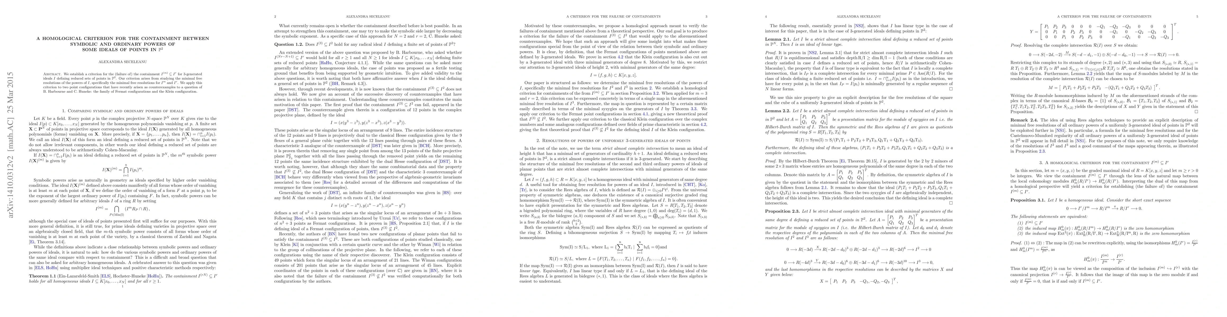 We establish a criterion for the (failure of) the containment $I^{(m)}\subset I^r$ for 3-generated ideals $I$ defining reduced sets of points in $\mathbb{P}^2$. Our criterion arises from studying the minimal free resolutions of the powers of $I$, specifically the minimal free resolutions for $I^m$ and $I^r$. We apply this criterion to two point configurations that have recently arisen as counterexamples to a question of B. Harbourne and C. Huneke: the Fermat configuration and the Klein configuration.