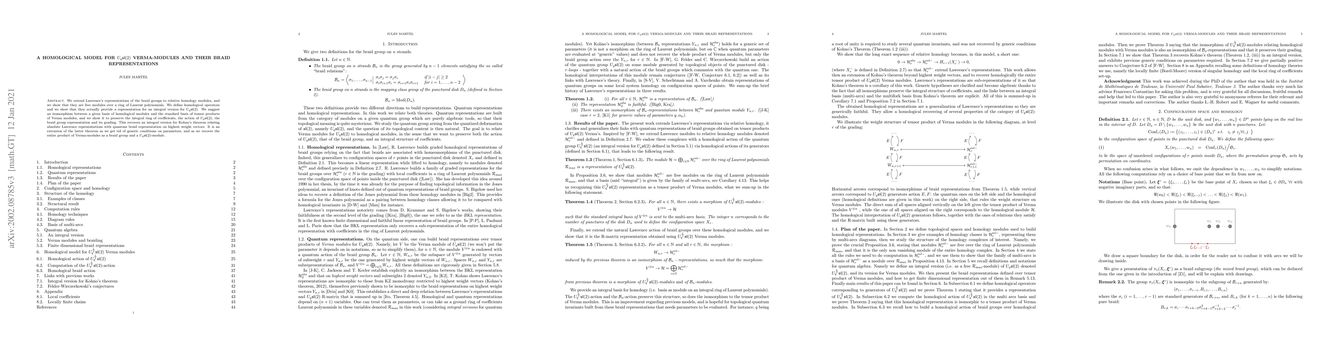 This paper constructs a homological model for $U_q \mathfrak{sl}(2)$ Verma modules, establishing an isomorphism between homological modules and tensor products of Verma modules, and extending Lawrence's braid group representations to relative homology modules as free modules over a Laurent polynomial ring. The work removes generic parameter conditions and recovers an integral version of Kohno's theorem.