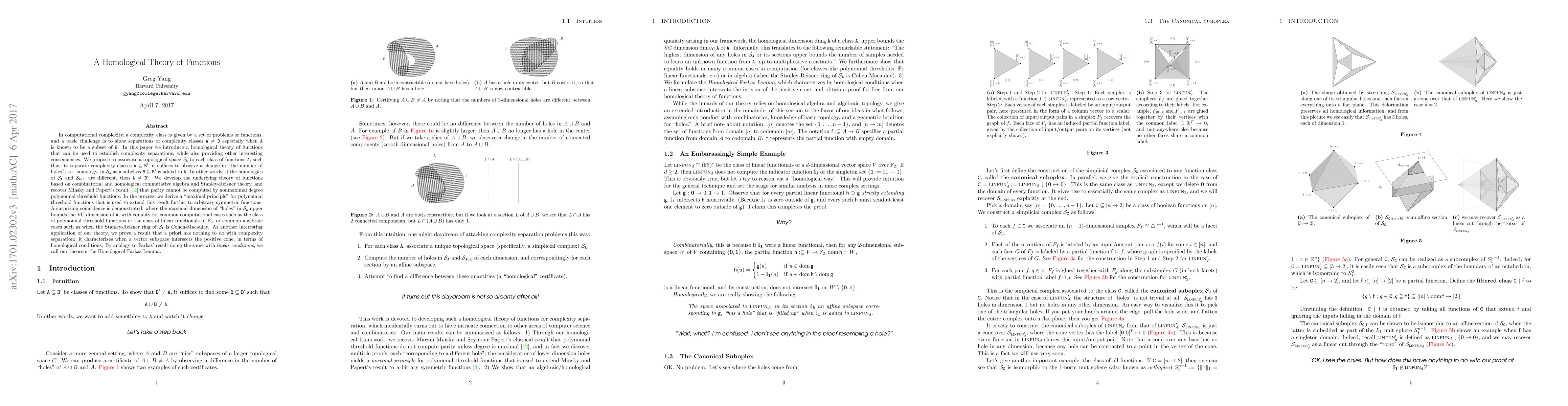 In computational complexity, a complexity class is given by a set of problems or functions, and a basic challenge is to show separations of complexity classes $A \not= B$ especially when $A$ is known to be a subset of $B$. In this paper we introduce a homological theory of functions that can be used to establish complexity separations, while also providing other interesting consequences. We propose to associate a topological space $S_A$ to each class of functions $A$, such that, to separate complexity classes $A \subseteq B'$, it suffices to observe a change in "the number of holes", i.e. homology, in $S_A$ as a subclass $B$ of $B'$ is added to $A$. In other words, if the homologies of $S_A$ and $S_{A \cup B}$ are different, then $A \not= B'$. We develop the underlying theory of functions based on combinatorial and homological commutative algebra and Stanley-Reisner theory, and recover Minsky and Papert's 1969 result that parity cannot be computed by nonmaximal degree polynomial threshold functions. In the process, we derive a "maximal principle" for polynomial threshold functions that is used to extend this result further to arbitrary symmetric functions. A surprising coincidence is demonstrated, where the maximal dimension of "holes" in $S_A$ upper bounds the VC dimension of $A$, with equality for common computational cases such as the class of polynomial threshold functions or the class of linear functionals in $\mathbb F_2$, or common algebraic cases such as when the Stanley-Reisner ring of $S_A$ is Cohen-Macaulay. As another interesting application of our theory, we prove a result that a priori has nothing to do with complexity separation: it characterizes when a vector subspace intersects the positive cone, in terms of homological conditions. By analogy to Farkas' result doing the same with *linear conditions*, we call our theorem the Homological Farkas Lemma.