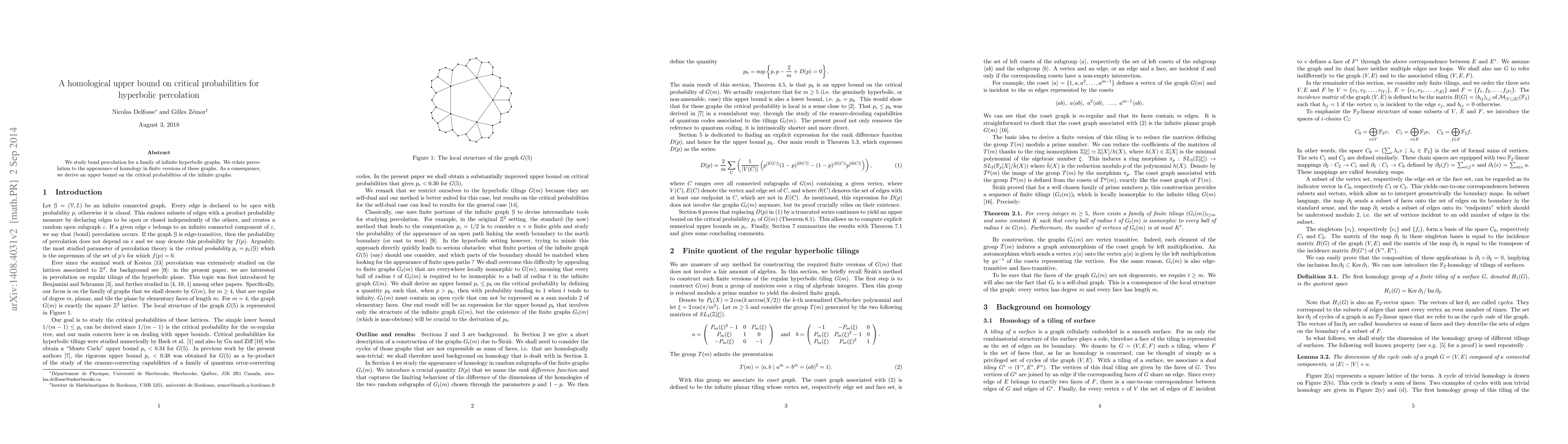 We study bond percolation for a family of infinite hyperbolic graphs. We relate percolation to the appearance of homology in finite versions of these graphs. As a consequence, we derive an upper bound on the critical probabilities of the infinite graphs.