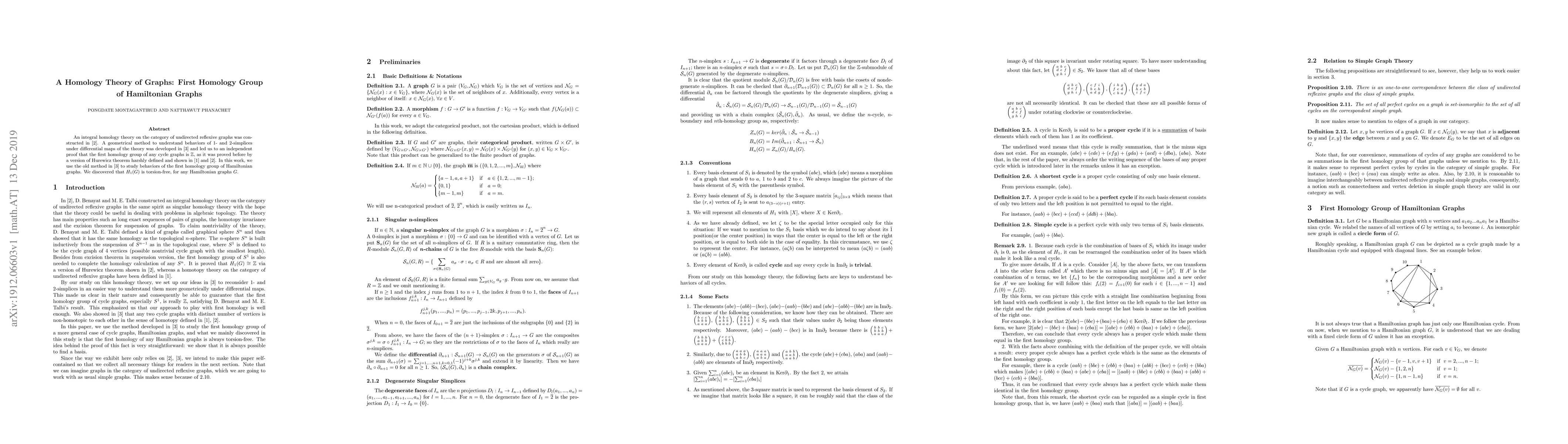 An integral homology theory on the category of undirected reflexive graphs was constructed in [2]. A geometrical method to understand behaviors of $1$- and $2$-simplices under differential maps of the theory was developed in [3] and led us to an independent proof that the first homology group of any cycle graphs is $\mathbb{Z}$, as it was proved before by a version of Hurewicz theorem harshly defined and shown in [1] and [2]. In this work, we use the old method in [3] to study behaviors of the first homology group of Hamiltonian graphs. We discovered that $H_1(G)$ is torsion-free, for any Hamiltonian graphs $G$.