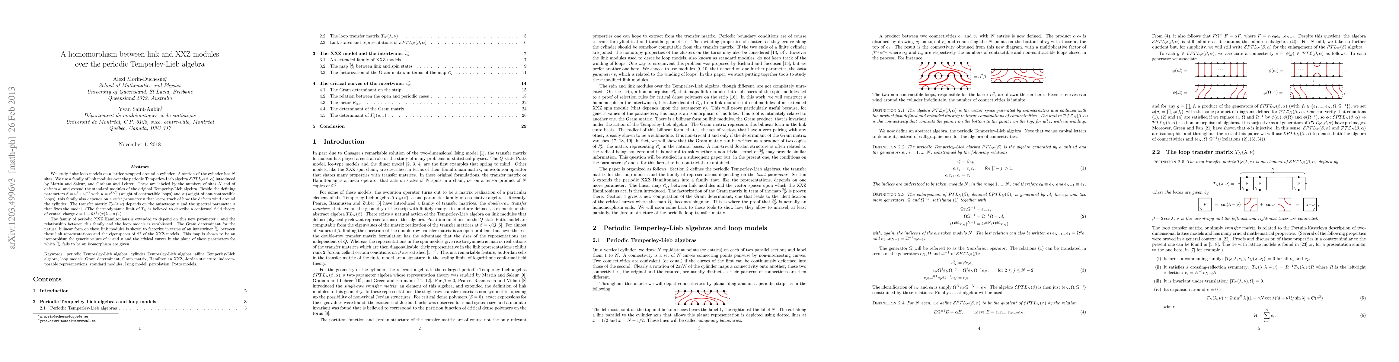 We study finite loop models on a lattice wrapped around a cylinder. A section of the cylinder has N sites. We use a family of link modules over the periodic Temperley-Lieb algebra EPTL_N(\beta, \alpha) introduced by Martin and Saleur, and Graham and Lehrer. These are labeled by the numbers of sites N and of defects d, and extend the standard modules of the original Temperley-Lieb algebra. Beside the defining parameters \beta=u^2+u^{-2} with u=e^{i\lambda/2} (weight of contractible loops) and \alpha (weight of non-contractible loops), this family also depends on a twist parameter v that keeps track of how the defects wind around the cylinder. The transfer matrix T_N(\lambda, \nu) depends on the anisotropy \nu and the spectral parameter \lambda that fixes the model. (The thermodynamic limit of T_N is believed to describe a conformal field theory of central charge c=1-6\lambda^2/(\pi(\lambda-\pi)).) The family of periodic XXZ Hamiltonians is extended to depend on this new parameter v and the relationship between this family and the loop models is established. The Gram determinant for the natural bilinear form on these link modules is shown to factorize in terms of an intertwiner i_N^d between these link representations and the eigenspaces of S^z of the XXZ models. This map is shown to be an isomorphism for generic values of u and v and the critical curves in the plane of these parameters for which i_N^d fails to be an isomorphism are given.