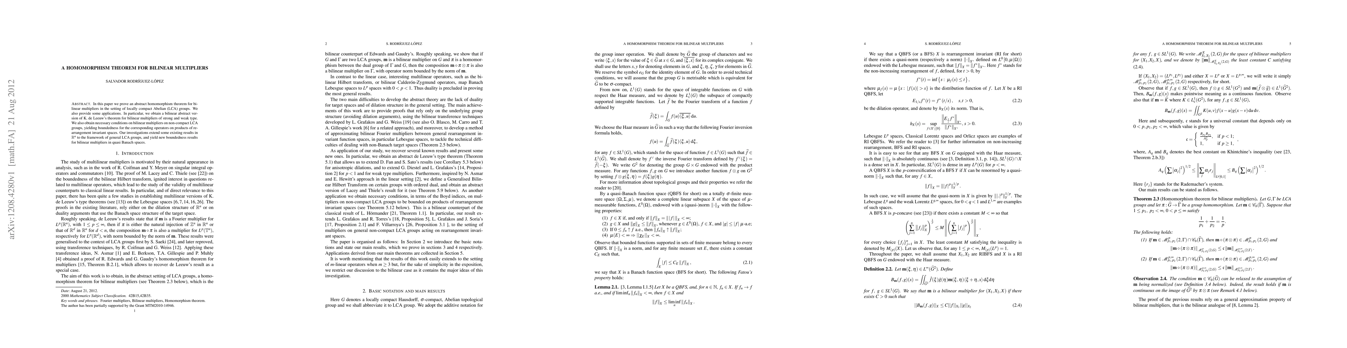 This paper establishes an abstract homomorphism theorem for bilinear multipliers in locally compact Abelian groups, extending known results from Euclidean spaces to LCA groups and providing applications, including a bilinear version of K. de Leeuw's theorem and new boundedness results for operators in quasi Banach spaces.